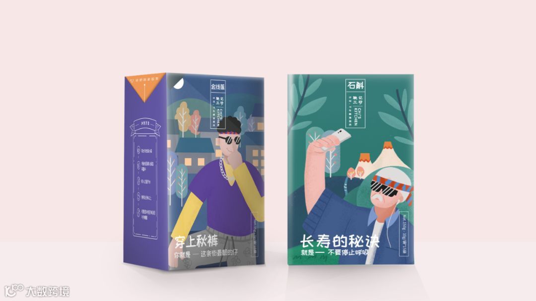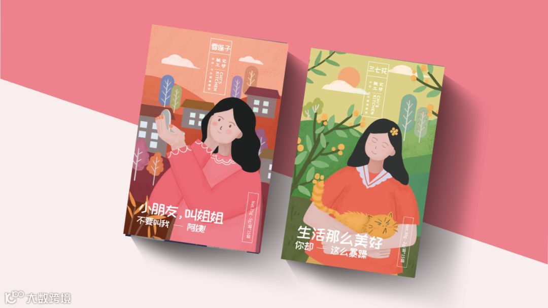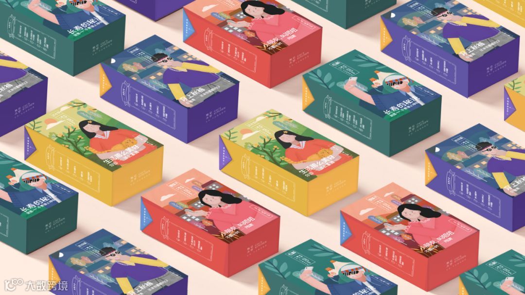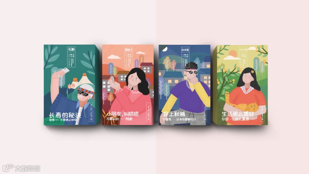 插画的人物分为男性和女性,辐射更多的潜在用户,女性的包装采用红色+绿色的主色系组合,用精准的洞察与用户进行深刻的沟通