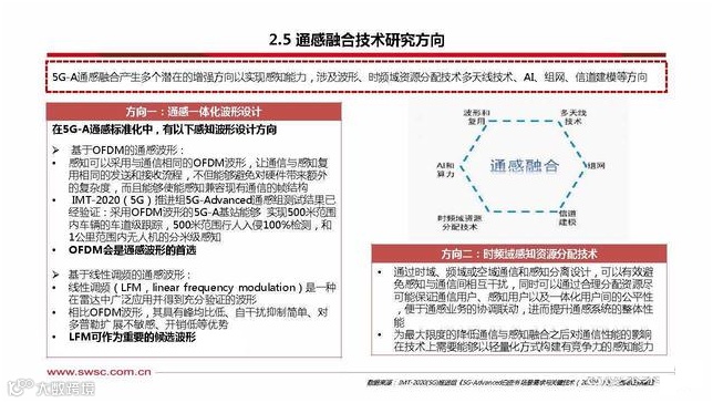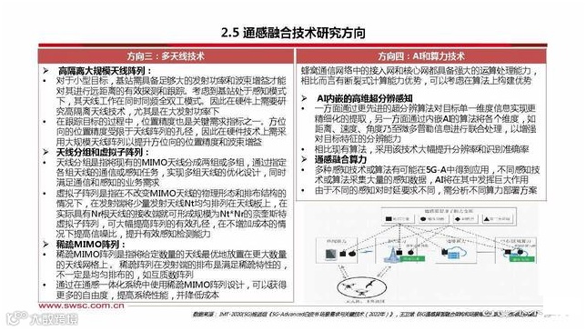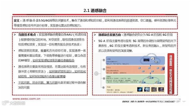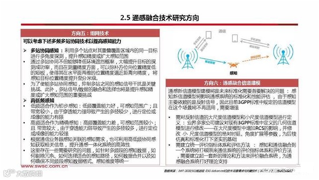 当前技术难点:实现通感融合需要自身AAU(有源天线 )能够提供独立的对地、对空波束,既包括通信波束也 包括感知波束,实现这一目标需克服众多技术挑战:感知波束的宽度、数量和方向动态可调,实现通感一体 要需要对基站高度、下倾角等参数进行规划,建立合适 的RF模型,如何实现感知波束的最优参数组合 。通信系统主要是采用连续波。而雷达既有连续波,也有 脉冲波(周期性发送),如何做好波形设计,如何优化 帧结构,如何对时隙进行合理分配需要 。干扰问题、同步问题、算力问题也是发展过程中亟待解 决的问题。