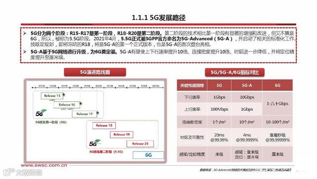 5G-A基于5G网络进行升级,为6G奠定基。5G-A有望使上下行速率提升10倍、连接密度提升10倍、时延进一步降低,并将定位精 度提升至厘米级。