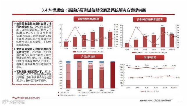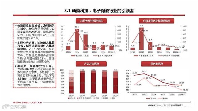 公司营收恢复增长,净利润仍 在减少。2023年前三季度,公 司实现营收2.6亿元,同比增加 5.3%;归母净利润0.3亿元,同 比增加减少52.1%。主营业务方面,滤波器占比超 70%,低互调无源组件占比逐 渐增加。2018-2022年, 公司 主营业务中滤波器占比始终超 70%,低互调无源组件占比从 7.4%波动增长至10.1%,天线、 谐振器的业务占比显著减少。毛利率 、 净 利 率 双 双 下 降 。2018-2023Q1-3年公司毛利率、 净利率波动下降。2022年,公 司实现毛利率28.5%,同比下降 8.14pp,主要系滤波器产品的 毛利率下降所致。公司盈利能 力有待提高。