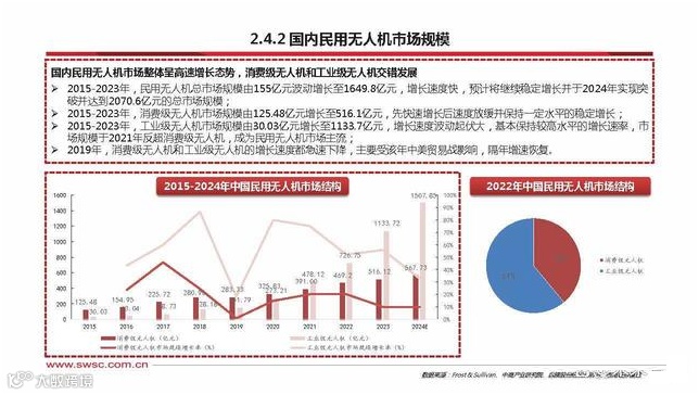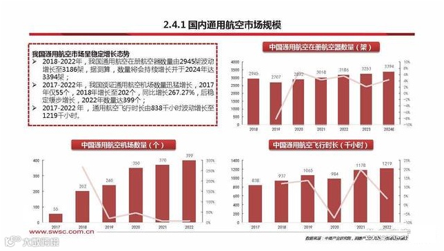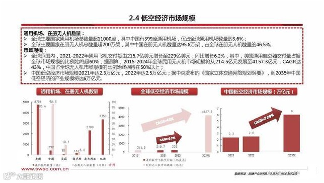 市场规模:全球范围内,2021-2022年通用飞机交付额由215.7亿美元增长至229亿美元,同比增长6.2%,其中,美国通用航空器交付量占据 全球市场规模的比例始终超60%;据测算,2015-2024年全球民用无人机市场规模将从214.5亿元发展至4157.3亿元,CAGR达 43%,中国占全球无人机市场规模的比例始终保持在50%以上;中国低空经济市场规模2021年达2.3万亿元,2022年达2.5万亿元;据中央发布的《国家立体交通网络规划纲要》,到2035年中国 低空经济的产业规模将达6万亿元。