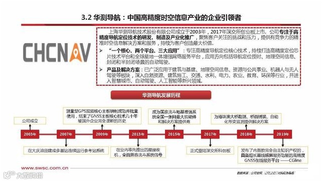 上海华测导航技术股份有限公司成立于2003年,2017年深交所创业板上市。公司专注于高 精度导航定位技术的研发、制造及产业化推广,聚焦客户关注的挑战和压力,提供有竞争力的精 准时空信息解决方案和服务,持续为客户创造最大价值。“一个核心、两个平台、三大应用”:专注高精度导航定位核心技术,持续打造高精度定位芯 片技术平台和全球星地一体增强网络服务平台,应用方向包括导航定位授时、地理空间信息、 封闭和半封闭场景的自动驾驶。产品及解决方案:已广泛应用于建筑与基建、地理空间信息、资源与公共事业、机器人与无人 驾驶等板块,深入自然资源、建筑施工、交通、水利、电力、农业、教育、环保等行业,并进入智慧城市、自动驾驶、人工智能等新兴领域。