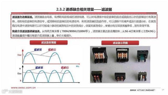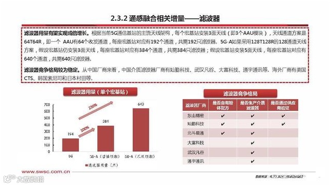 滤波器为选频装置。滤波器是由电容、电感和电阻组成的滤波电路。可以对电源线中特定频率的频点或该频点以外的频率进行有效滤 除,得到特定频率的电源信号,或消除特定频率后的电源信号。利用滤波器的选频作用,可以滤除干扰噪声或进行频谱分析。在直流 稳压电源中滤波电路可以尽可能减小脉动的直流电压中的交流成分,保留其直流成分,使输出电压纹波系数降低,波形变得平滑。陶瓷介质滤波器进展加速。从传统方案来看(700M/900M/2100M等),滤波器主要还是金属腔体;从5G-A方案来看(主推4.9G), 通道数量提升叠加陶瓷介质滤波器上量,单价大幅提升。