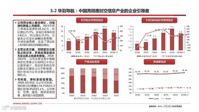 公司营业收入稳定增长,归母 净利润呈上升趋势。2023年前 三季度实现营收18.3亿元,同 比增长25.9%。实现归母净利润 2.8亿元,同比增长25.9%。主要系公司及时调整经营策略、 市场拓展策略,实现了营业收 入和净利润的持续稳定增长。主营业务方面,高精度定位装 备占比过半,系统应用及解决 方案业务占比逐年增加。2018- 2022年,公司主营业务中高精 度定位装备占比始终过半但占 比逐渐减少,相应的系统应用 及解决方案的占比不断提高, 预计将成为公司主要业绩新的 增长点。毛利率 、 净 利 率 缓 慢 增 加 。2018-2023Q1-3,公司毛利率、 净利率分别缓慢从54.3%和11.3 增长至58.4%和15.1%,公司降 本、控费、提质、增效效果显 著,盈利能力明显提高。