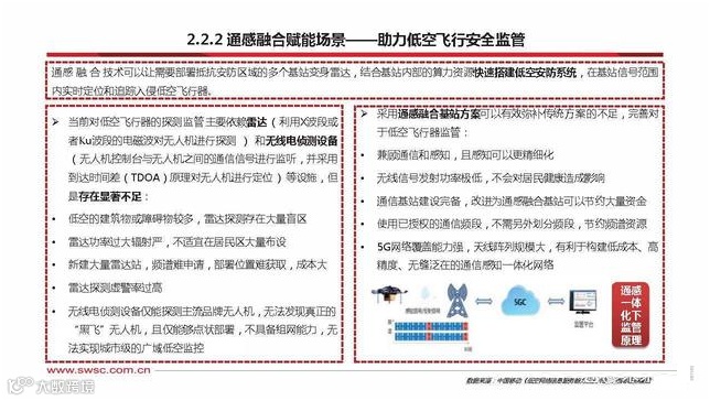通感 融 合 技术可以让需要部署抵抗安防区域的多个基站变身雷达,结合基站内部的算力资源快速搭建低空安防系统,在基站信号范围 内实时定位和追踪入侵低空飞行器。