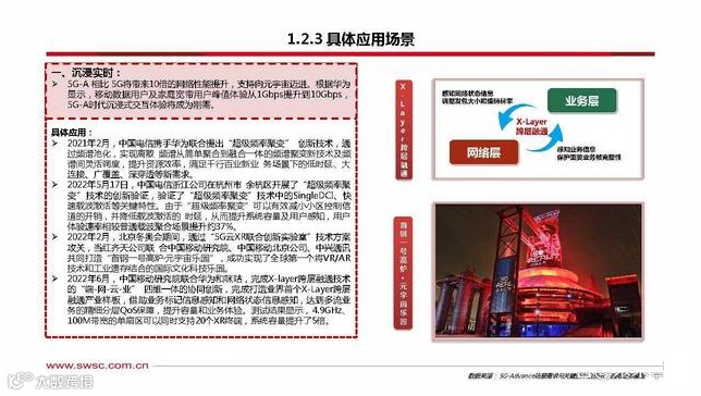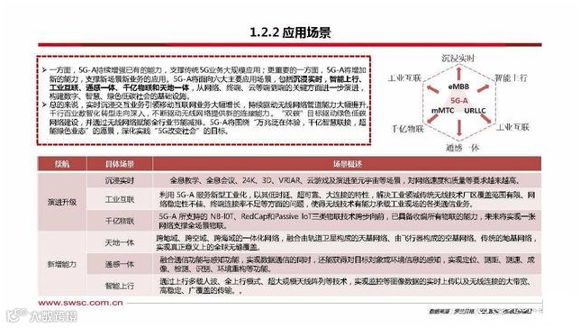 一方面,5G-A持续增强已有的能力,支撑传统5G业务大规模应用;更重要的一方面,5G-A将增加 新的能力,支撑新场景新业务的应用。5G-A将面向六大主要应用场景,包括沉浸实时,智能上行、 工业互联、通感一体、千亿物联和天地一体,从网络、终端、云等端到端的关键方面进一步演进, 构建数字、智慧、绿色低碳社会的基础设施。