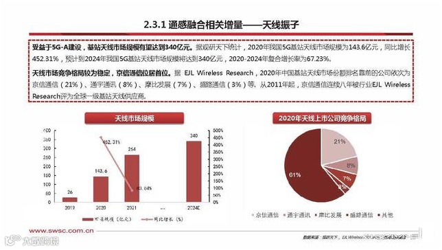 天线振子是构成天线的最基本单位。天线振子是天线上的重要元器件,是发射和接收高频振荡信号的一段金属导体。具有导向和放大 电磁波的作用,使天线接收到的电磁信号更强。天线振子分为根本振子、对称振子、半波对称振子,这与天线的导线长度和形状有关。两导线的间隔越近,电场被捆绑在两导线之间,辐射就会很弱;将两导线打开,电场就散播在周围的空间,辐射便会增强。天线振子实现量价齐升。从传统方案来看,单面64通道,3面192通道,传统5G基站的振子单价为10元以内;从5G-A方案来看,单面 提升至128通道,面数有望提升至3-5个,振子单价有望提升为10元以上。