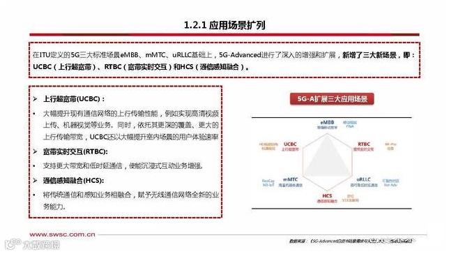 在ITU定义的5G三大标准场景eMBB、mMTC、uRLLC基础上,5G-Advanced进行了深入的增强和扩展,新增了三大新场景,即:UCBC(上行超宽带)、RTBC(宽带实时交互)和HCS(通信感知融合)。