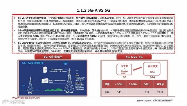5G-A不改变5G的网络架构,主要通过射频部分的改进、软件升级以及AI赋能,适应不同要求。例如:5G-A需要更加高性能设备来支持大量的数据传输 和处理,如4.9G的128T128R AUU将是5G-A面向通感一体等应用场景的主要建设方向;三载波聚合和通感一体等新技术需要运营商在BBU等网络设备上 增加相应的处理能力和射频接口,以支持额外的载波,同时,BBU等设备还需要具备更强大的处理能力和更灵活的软件架构,以便能够同时处理通信和 感知数据。
