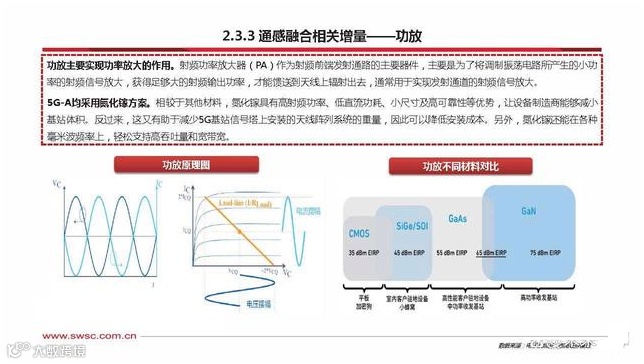 功放主要实现功率放大的作用。射频功率放大器(PA)作为射频前端发射通路的主要器件,主要是为了将调制振荡电路所产生的小功 率的射频信号放大,获得足够大的射频输出功率,才能馈送到天线上辐射出去,通常用于实现发射通道的射频信号放大。5G-A均采用氮化镓方案。相较于其他材料,氮化镓具有高射频功率、低直流功耗、小尺寸及高可靠性等优势,让设备制造商能够减小 基站体积。反过来,这又有助于减少5G基站信号塔上安装的天线阵列系统的重量,因此可以降低安装成本。另外,氮化镓还能在各种 毫米波频率上,轻松支持高吞吐量和宽带宽。