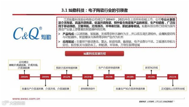 江苏灿勤科技股份有限公司成立于2004年,2021年在上交所科创板上市。公司专业从事微 波介质陶瓷、高温共烧陶瓷、低温共烧陶瓷、特种复合陶瓷等产品的研发、生产和销售,广泛应 用于移动通信、卫星导航、无线通讯、半导体封装、新能源等领域。灿勤科技目前已经成为国内 通信产业链上游重要的射频器件供应商。产品构成:以滤波器、谐振器、天线等多种元器件为主,并以低互调无源组件、金属陶瓷结构 与功能器件、射频模块与系统等多种产品作为补充 。应用领域:主要用于移动通信、雷达、射频电路、数据链、电子侦查与干扰、卫星通讯导航与 定位、航空航天与国防科工、新能源、半导体、万物互联等领域。