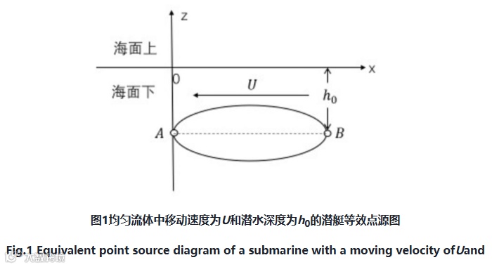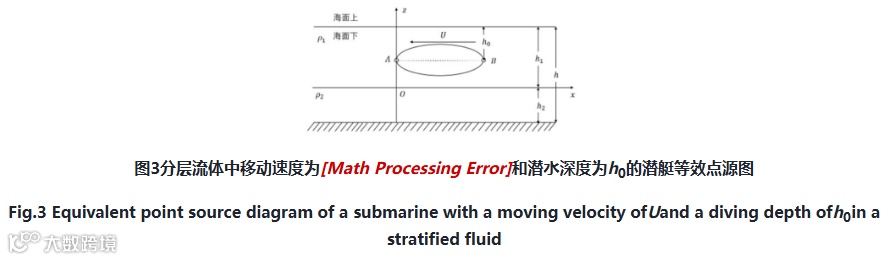 建立如图3所示的坐标系,x轴平行于潜艇航行方向,z轴沿点A垂直海面向上,y轴与x轴、z轴构成右手坐标系,将xoy平面放置于流体的密度分界面处。流场深度为h,上下流体深度分别为h1和h2,密度为ρ1和ρ2,椭球长轴到水面的距离为h0。