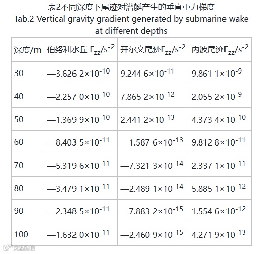 对潜艇在速度为20节、深度为30~100m进行尾迹仿真模拟,表2为尾迹对潜艇产生的扰动重力梯度。