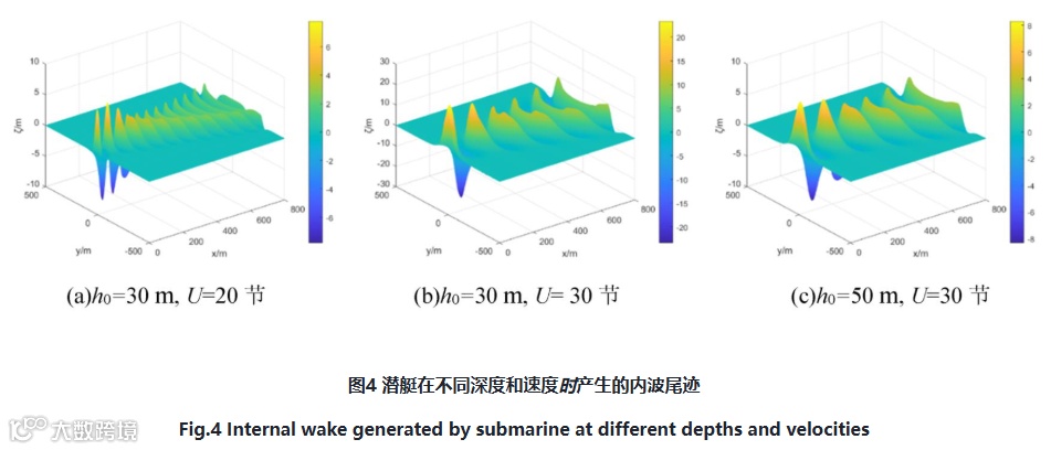 选取潜艇长度L=138 m和等效直径2r=12.5 m,潜深在h0=30 m、50m和航速U=20节、30节时产生的内波尾迹如图4所示,可以看出,内波尾迹分布在潜艇后方水面上。