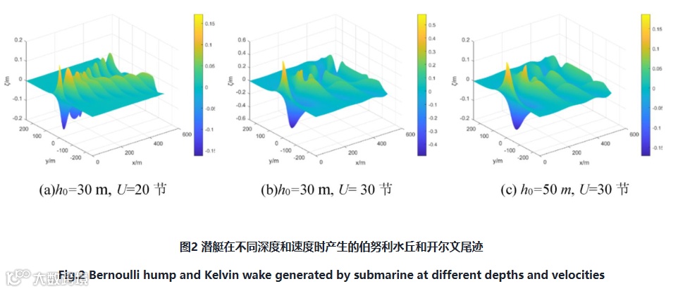 选取潜艇长度L=138 m和等效直径2r=12.5 m,潜深在h0=30 m、50m和航速U=20节、30节时产生的尾迹如图2所示。可以看出,伯努利水丘在潜艇上方,开尔文尾迹分布在潜艇后方水面上。