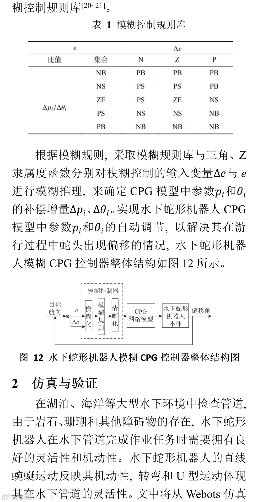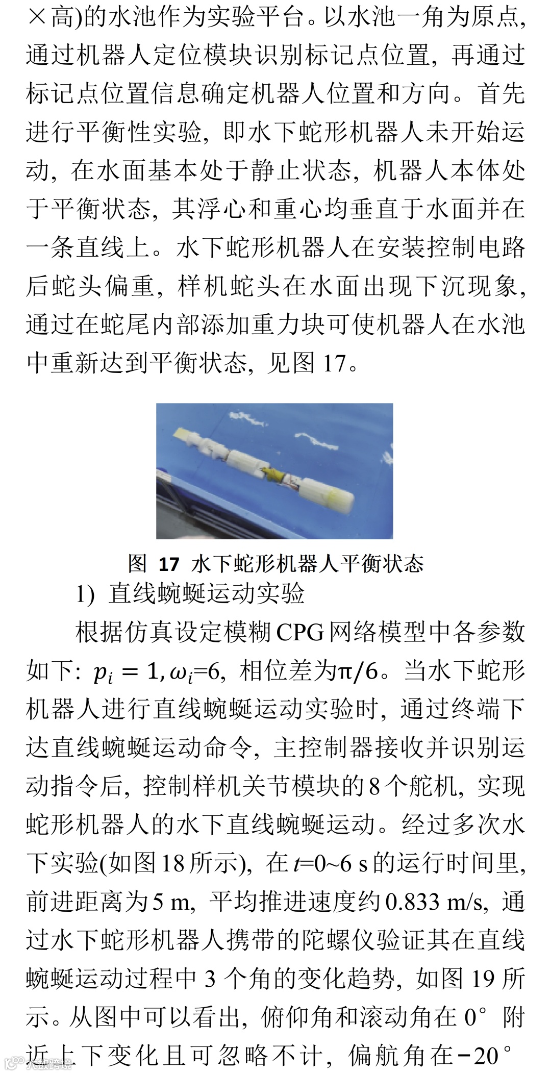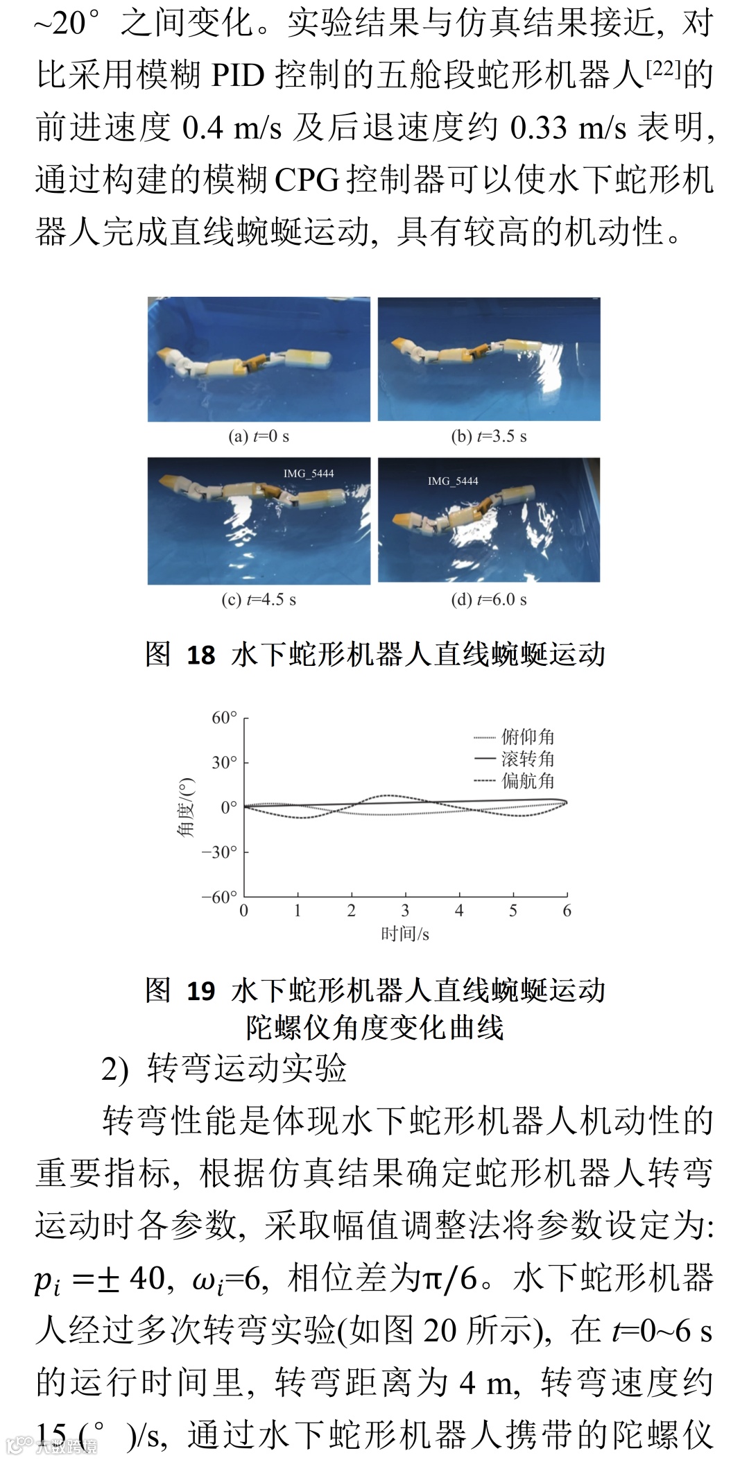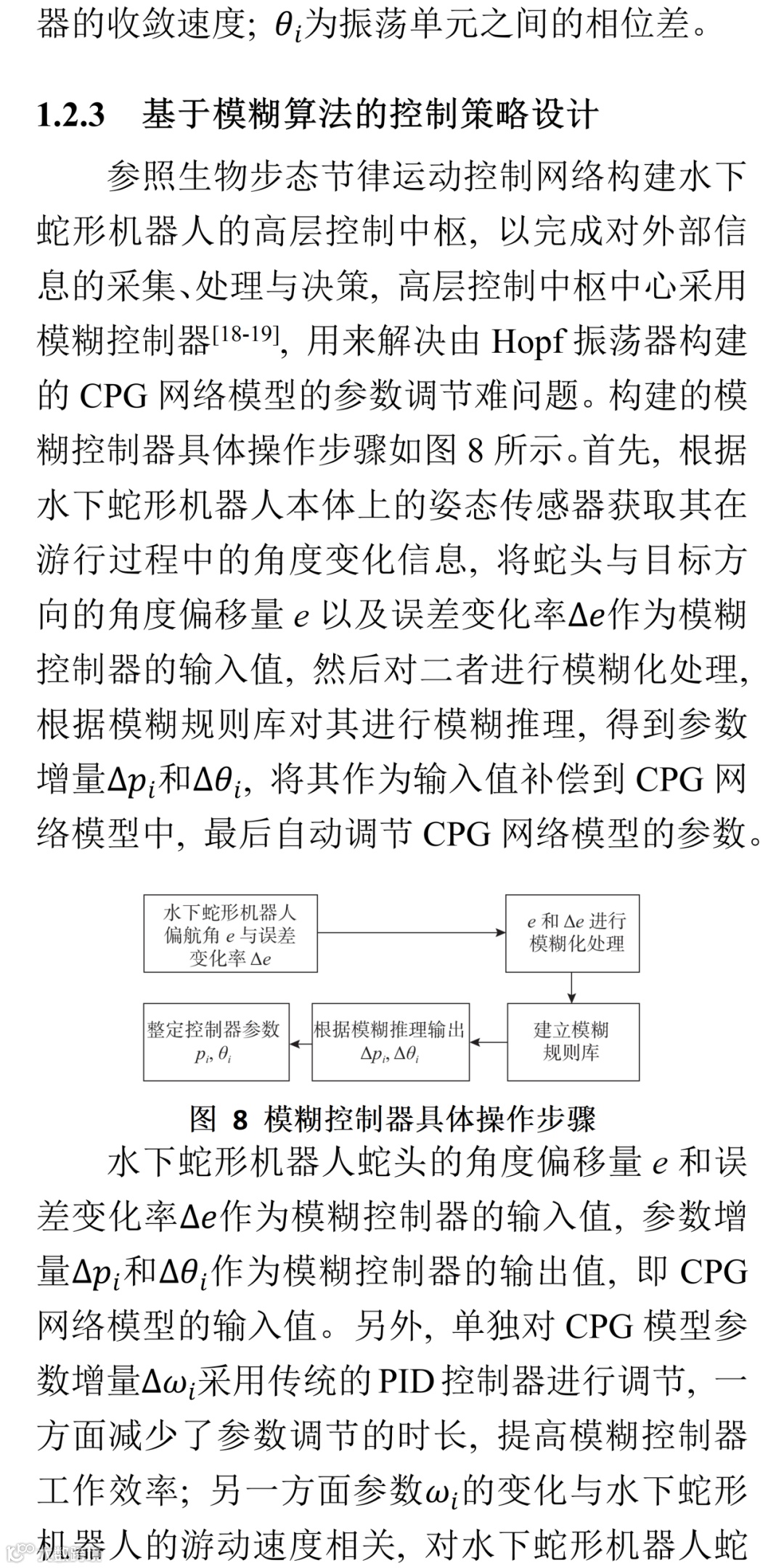 目前大部分蛇形机器人关节都为刚性结构, 采用电机或者舵机驱动, 这种设计在陆地上较容易控制, 但对于水下运动的蛇形机器人, 不仅要考虑到密封问题, 在面对水下受限空间非结构环境的干预作业任务时, 未知环境的接触和碰撞以及受限空间的复杂约束对机器人的运动控制提出了更高的要求。目前水下蛇形机器人仍普遍采用比例-积分-微分(proportional-integral-derivative, PID)控制、模糊控制和中枢模式生成(central pattern generator, CPG)控制等常规的运动控制方法, 由于水下环境的复杂性和特殊性, 仅靠一种控制方法无法实现其稳定游动, 大多采用2种控制算法结合来提高其游动性与稳定性。文中基于蛇类运动机理建立水下蛇形机器人运动学模型, 分别从水蛇的身体+蛇尾推进方式着手, 提出一种模糊CPG控制方法, 实现水下蛇形机器人的多模态游动控制。