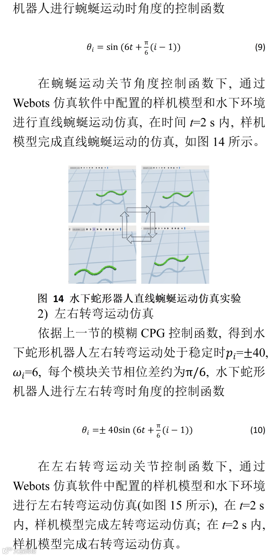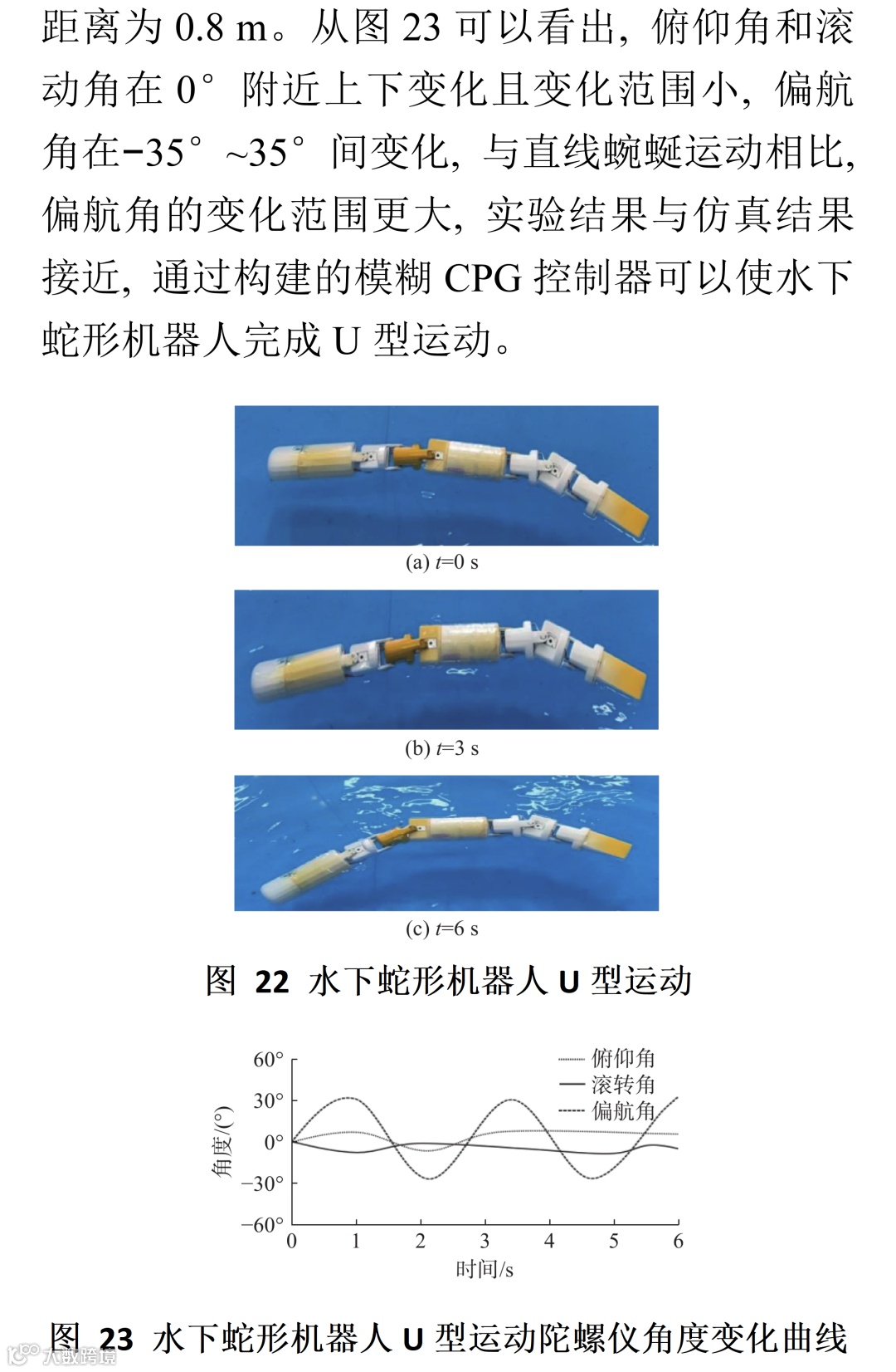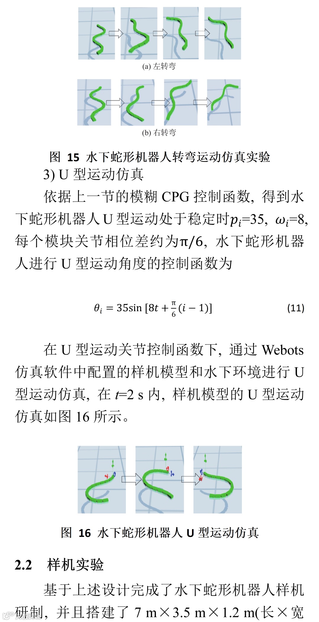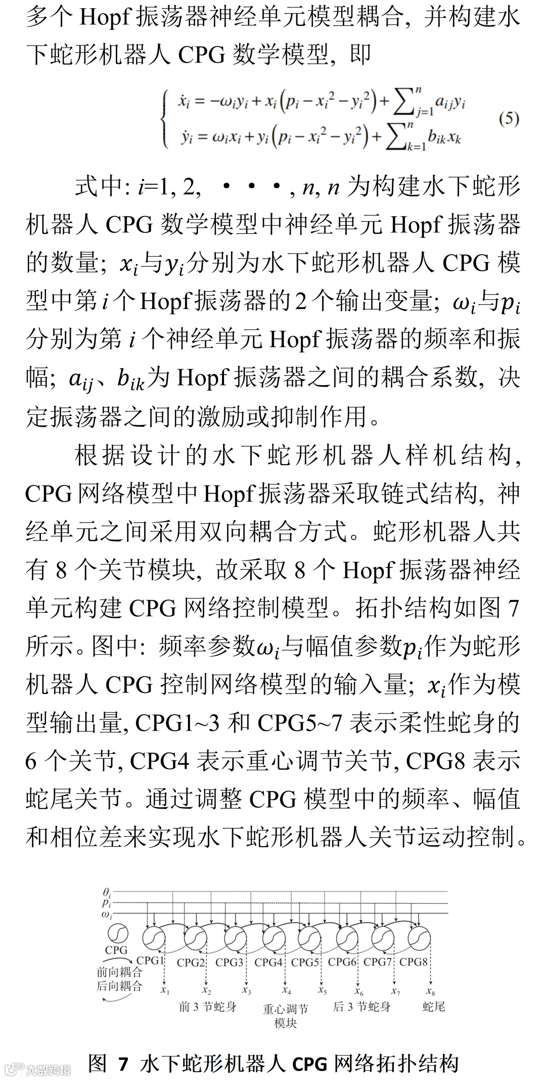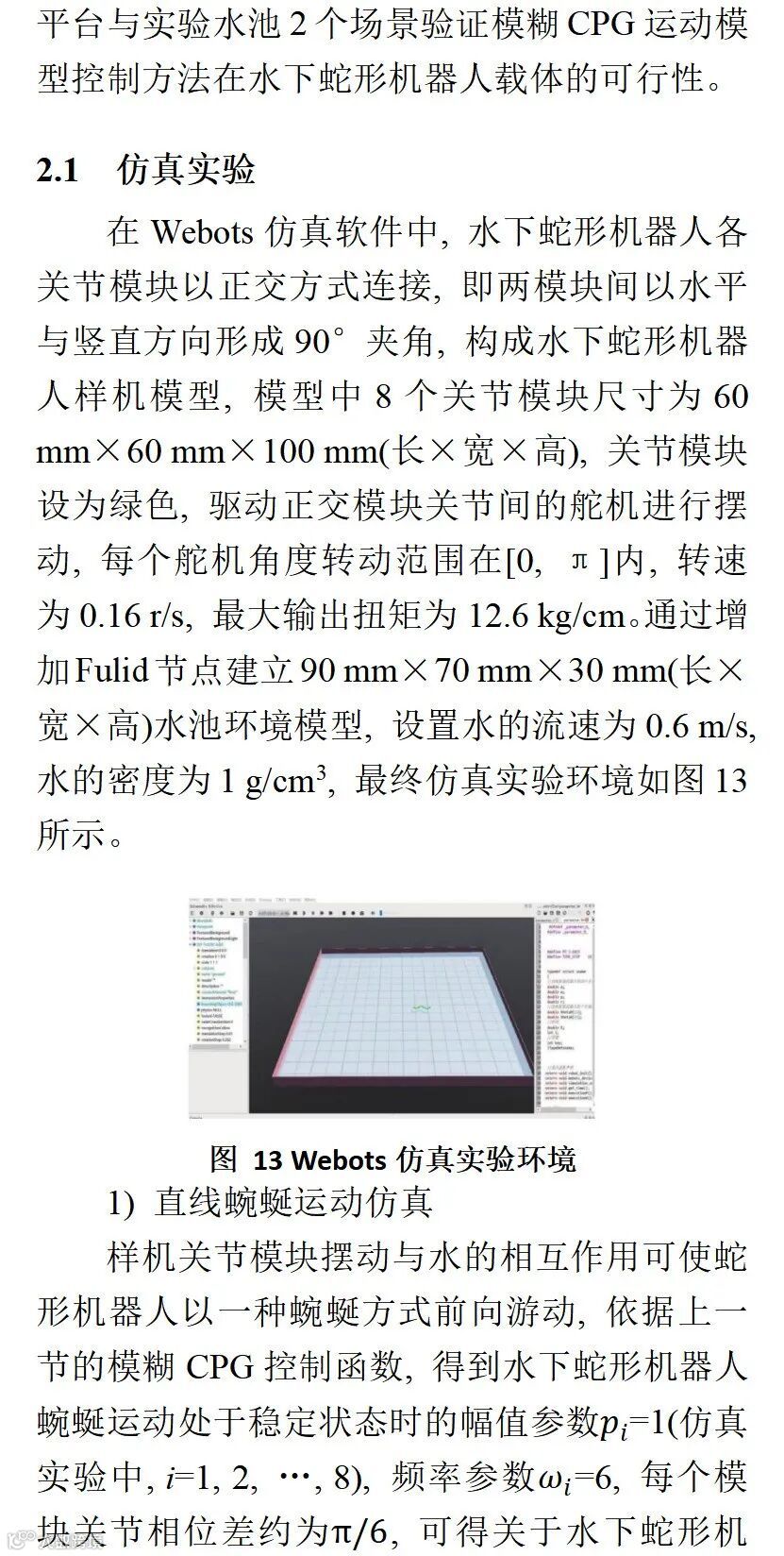 目前大部分蛇形机器人关节都为刚性结构, 采用电机或者舵机驱动, 这种设计在陆地上较容易控制, 但对于水下运动的蛇形机器人, 不仅要考虑到密封问题, 在面对水下受限空间非结构环境的干预作业任务时, 未知环境的接触和碰撞以及受限空间的复杂约束对机器人的运动控制提出了更高的要求。目前水下蛇形机器人仍普遍采用比例-积分-微分(proportional-integral-derivative, PID)控制、模糊控制和中枢模式生成(central pattern generator, CPG)控制等常规的运动控制方法, 由于水下环境的复杂性和特殊性, 仅靠一种控制方法无法实现其稳定游动, 大多采用2种控制算法结合来提高其游动性与稳定性。文中基于蛇类运动机理建立水下蛇形机器人运动学模型, 分别从水蛇的身体+蛇尾推进方式着手, 提出一种模糊CPG控制方法, 实现水下蛇形机器人的多模态游动控制。