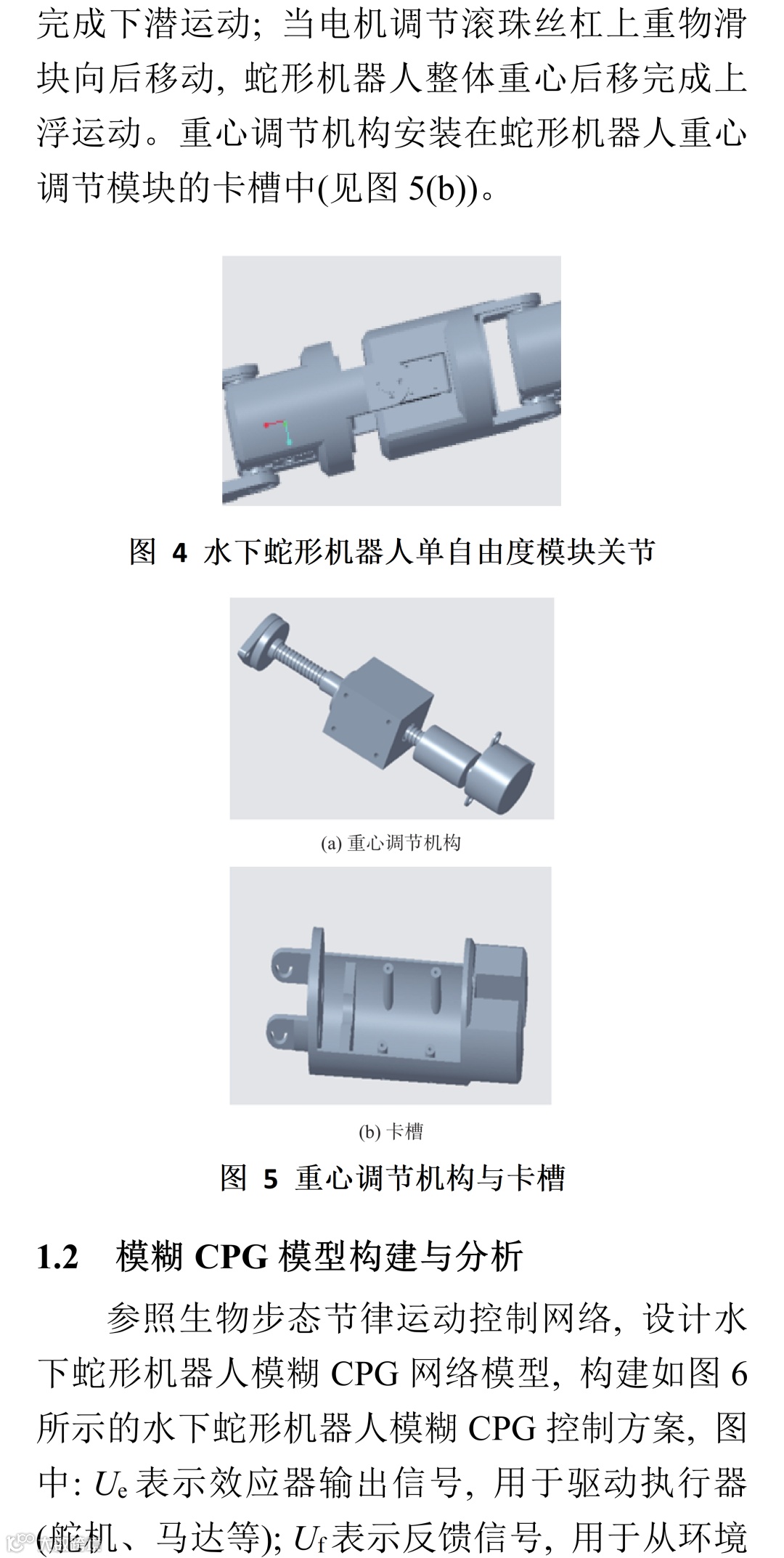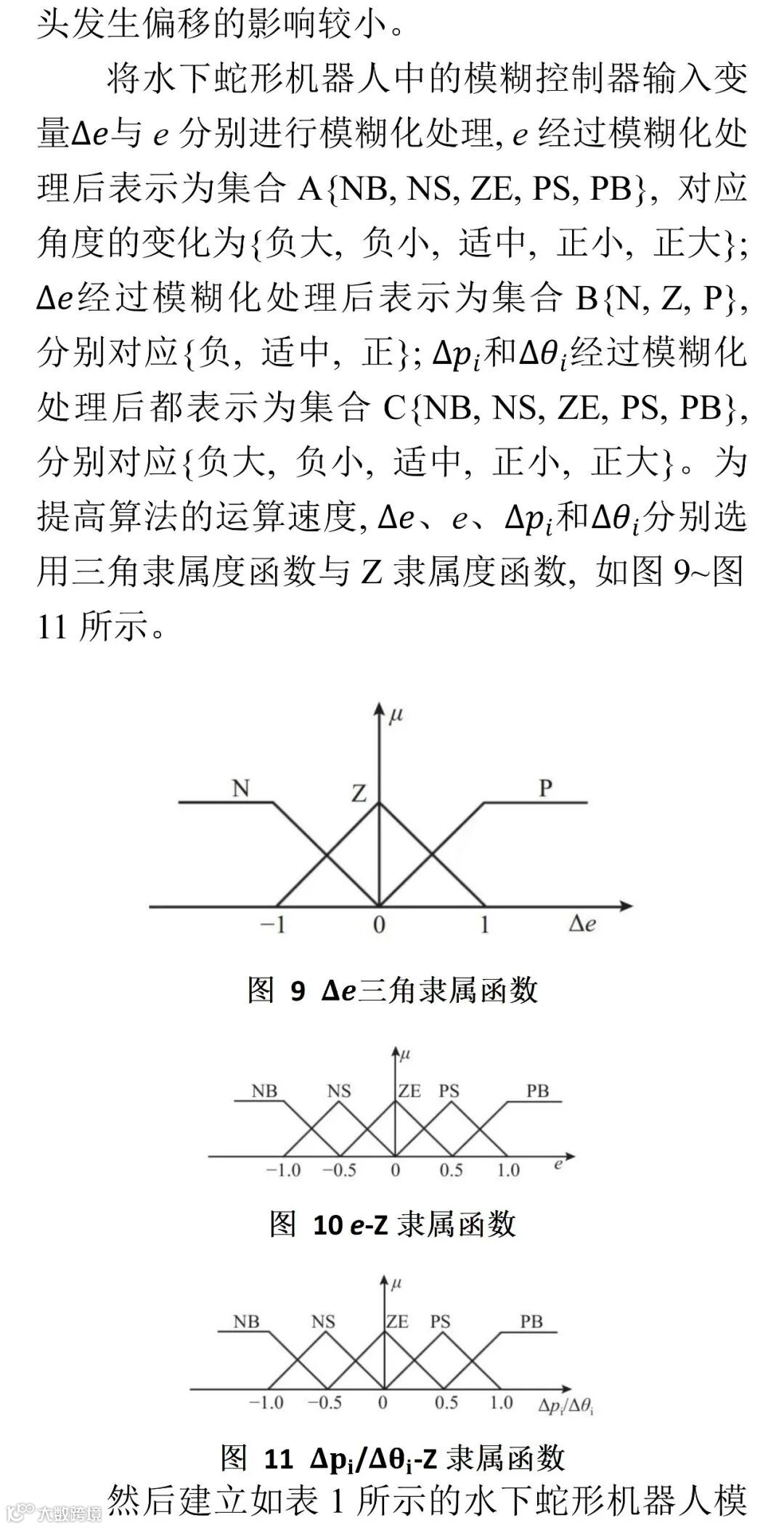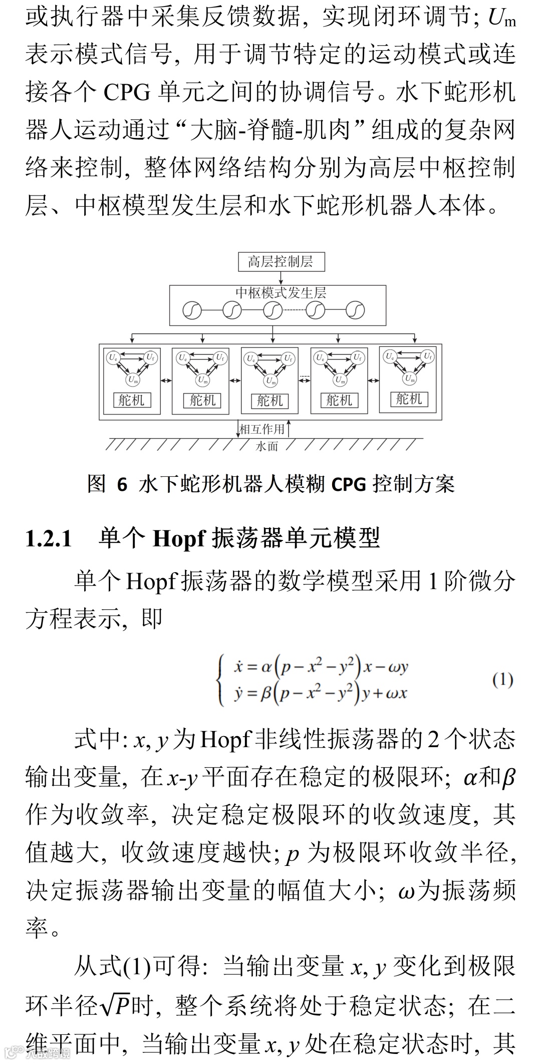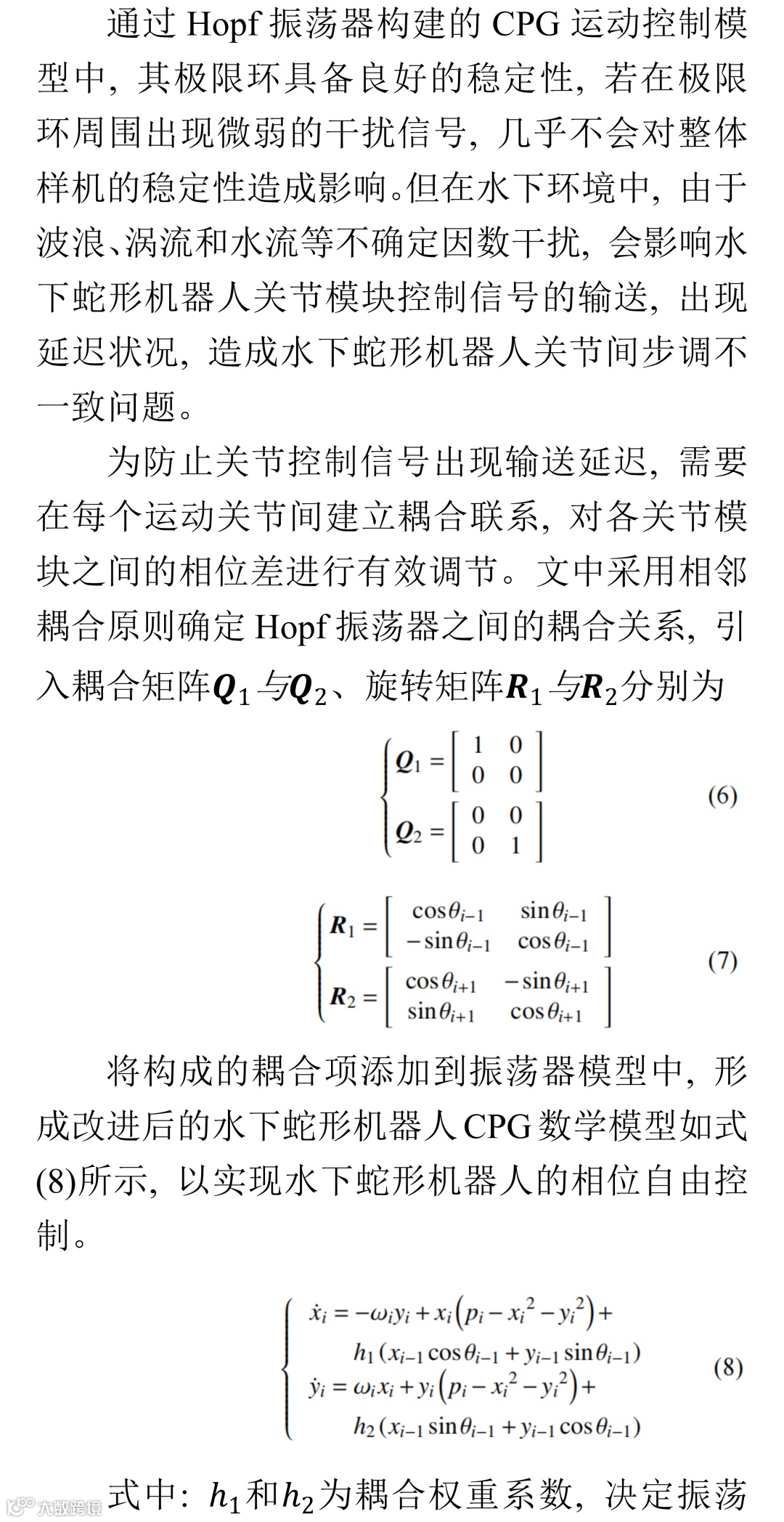 目前大部分蛇形机器人关节都为刚性结构, 采用电机或者舵机驱动, 这种设计在陆地上较容易控制, 但对于水下运动的蛇形机器人, 不仅要考虑到密封问题, 在面对水下受限空间非结构环境的干预作业任务时, 未知环境的接触和碰撞以及受限空间的复杂约束对机器人的运动控制提出了更高的要求。目前水下蛇形机器人仍普遍采用比例-积分-微分(proportional-integral-derivative, PID)控制、模糊控制和中枢模式生成(central pattern generator, CPG)控制等常规的运动控制方法, 由于水下环境的复杂性和特殊性, 仅靠一种控制方法无法实现其稳定游动, 大多采用2种控制算法结合来提高其游动性与稳定性。文中基于蛇类运动机理建立水下蛇形机器人运动学模型, 分别从水蛇的身体+蛇尾推进方式着手, 提出一种模糊CPG控制方法, 实现水下蛇形机器人的多模态游动控制。