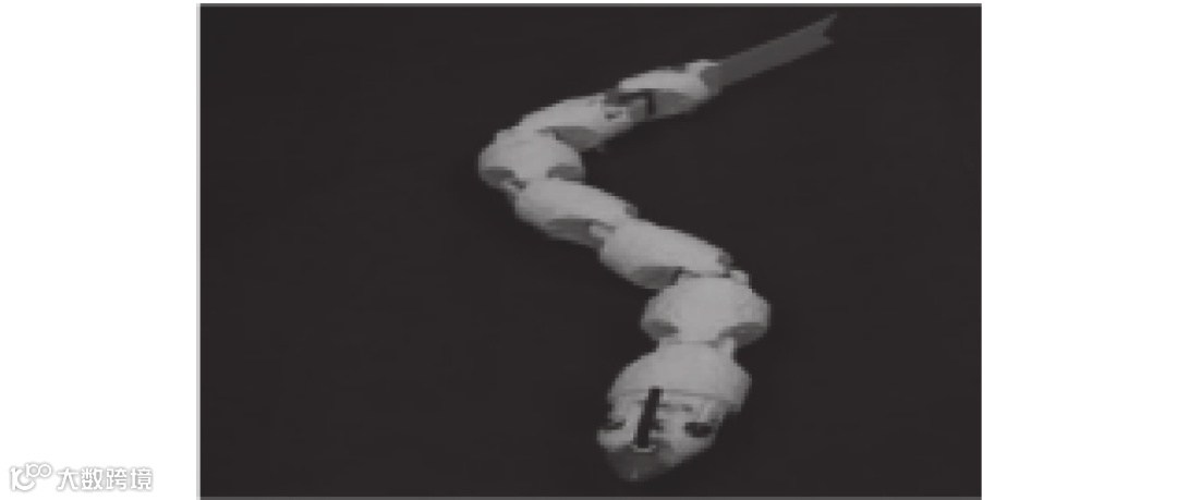 2017年, 挪威科技大学与海洋船舶公司合作, 首次设计出一款水下蛇形机器人Eelume[9], 如图1所示。Eelume依托模块化思想设计, 采用螺旋桨推进方式来实现定深悬浮、狭小空间移动等功能, 通过水深200 m测试证明可满足水下管道检测基本要求。此后, Huang等[10]研发了带有柔性尾鳍的水陆两栖蛇形机器人(如图2所示), 该机器人整体长度约126 cm, 关节模块直径约8.5 cm, 整体质量5.95 kg, 7个关节模块均采用正交方式连接, 尾鳍长度约为20 cm, 摆动幅度为180°, 在水中的游动速度可达0.5 m/s。张军豪等[11]开发刚性推进和软关节混合驱动控制的水下蛇形机器人动力学模型, 通过仿真验证了机器人能够进行包括正向和向后直线运动、偏航转弯、俯仰运动和螺旋上升运动等多模态游泳行为, 总体结果表明了所开发的动态模型在预测机器人轨迹、位置、方向和速度方面的有效性和通用功能性。