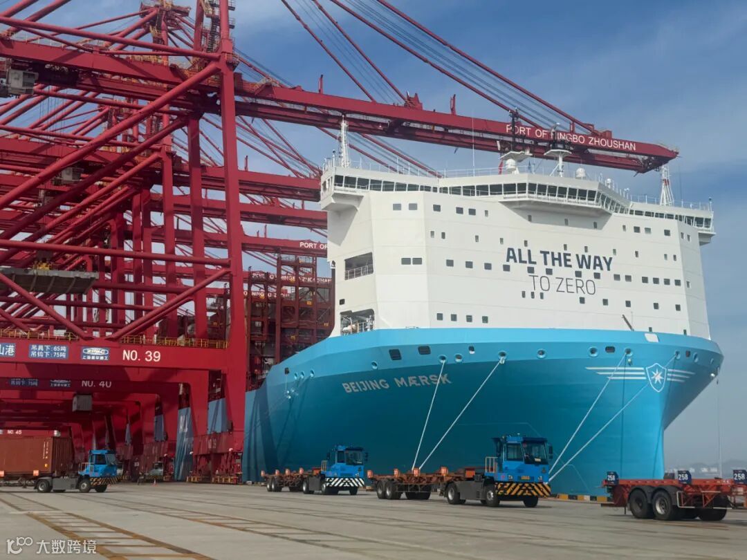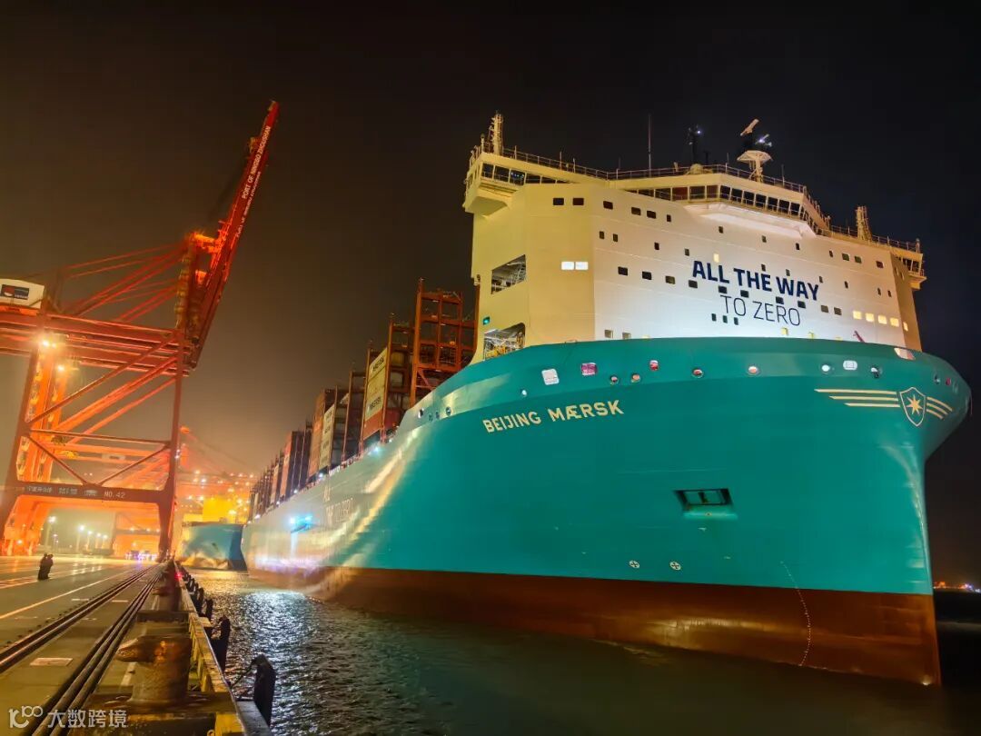 “北京马士基”轮服务于双子星联盟航线,船长350米、宽56米,可装载17480标准箱,是全球首批超17000标准箱甲醇双燃料集装箱船之一。