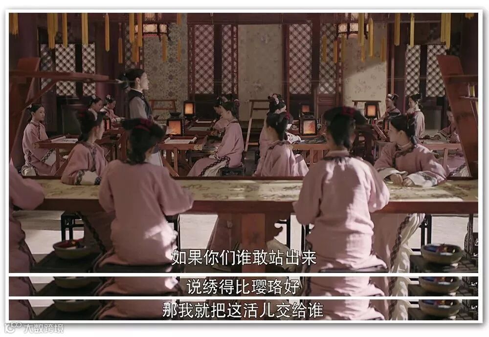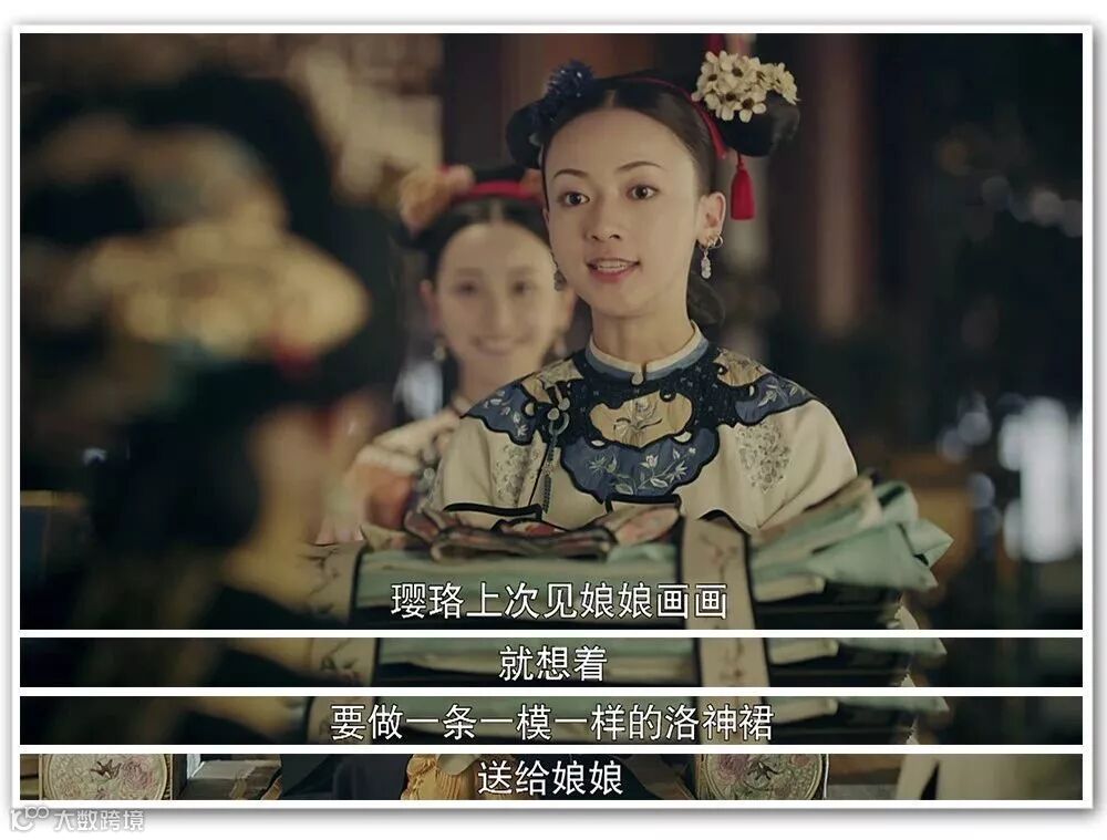 剧中:宫女玲珑嫉妒璎珞得张嬷嬷欢心,设计破坏璎珞给皇后绣的凤袍。璎珞冷静应对,想出办法解除危机并因此得到皇后赏识。