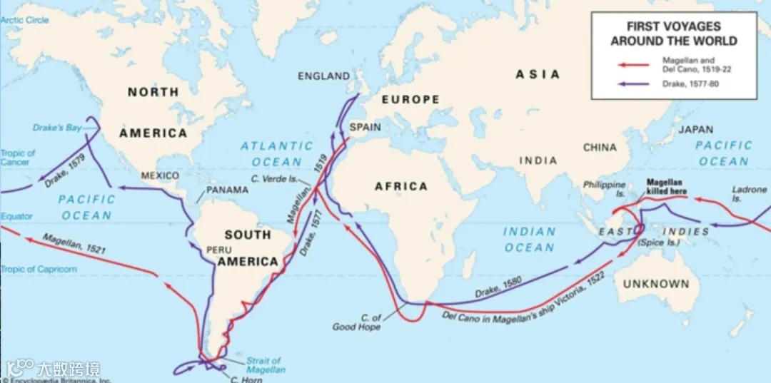 1519年,葡萄牙人麦哲伦在西班牙政府资助下,率领船队作首次环球航行。他们从西班牙出发,渡过大西洋,于次年10月底经南美洲南端的海峡(后来被称为麦哲伦海峡),驶入浩瀚无际的太平洋。1521年3月,麦哲伦去世后,其副手继续航行,于1522年9月回到西班牙。麦哲伦的环球航行,第一次证实了地圆说。