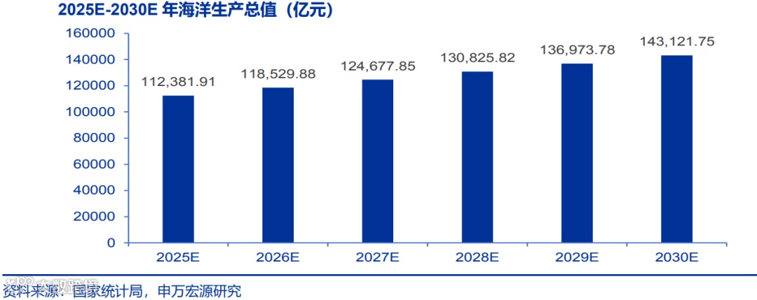 中国海洋生产总值 2024 年为 10.54 万亿人民币,预计到 2030 年将达到 14.31 万亿,年复合增速约 7.86%。