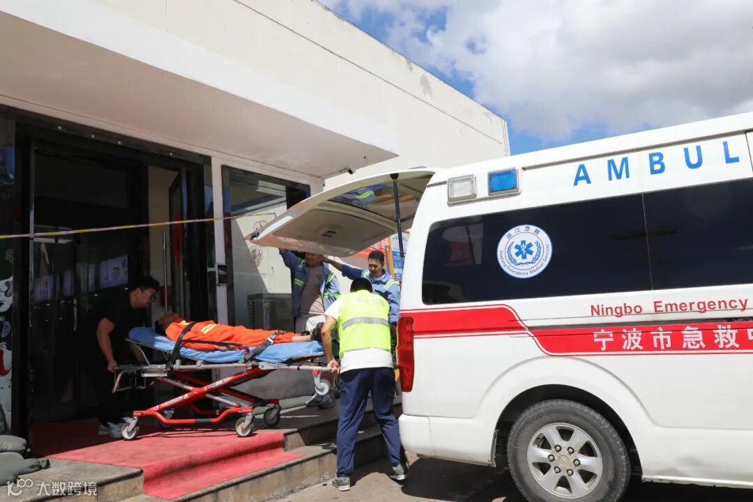 演练模拟码头员工就餐后出现群体性呕吐、腹痛等中毒症状。首例“病员”报告后仅2分钟,应急预案立即启动。依托绿色通道机制,120救护车于13时50分精准抵达演练现场,全程响应仅用时18分钟。随后,医护人员迅速完成“重症患者”评估与转运,并通过港强公司与北仑区卫健局联络机制同步实现信息高效互通。