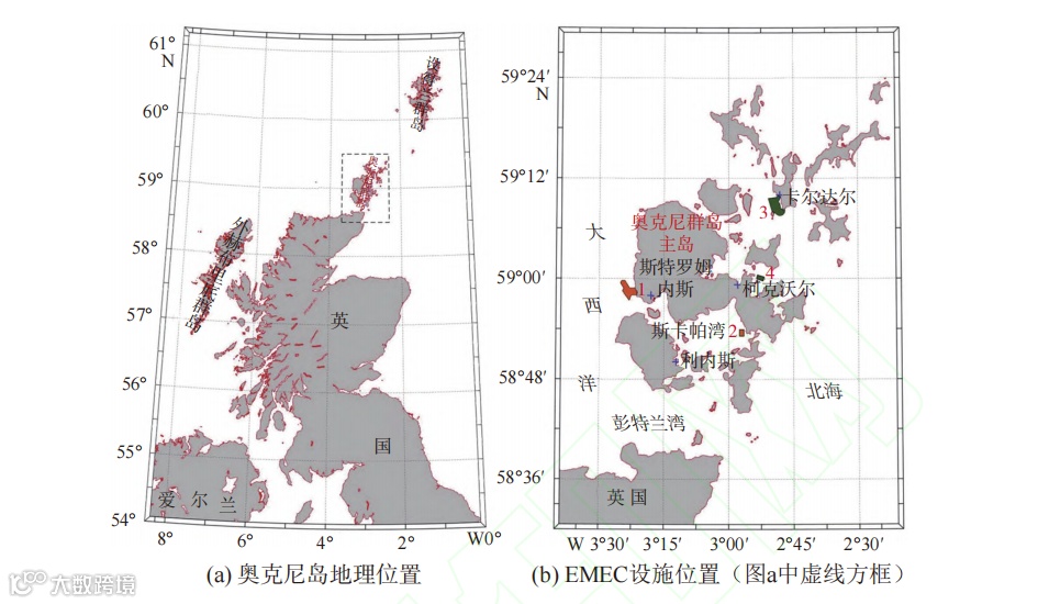 图b中1为 Billia Croo波浪能测试点,2为Scapa Flow比例模型波浪能测试点,3为Fall of Warness潮流能测试点,4为 Shapinsay Sound比例模型潮流能测试点。