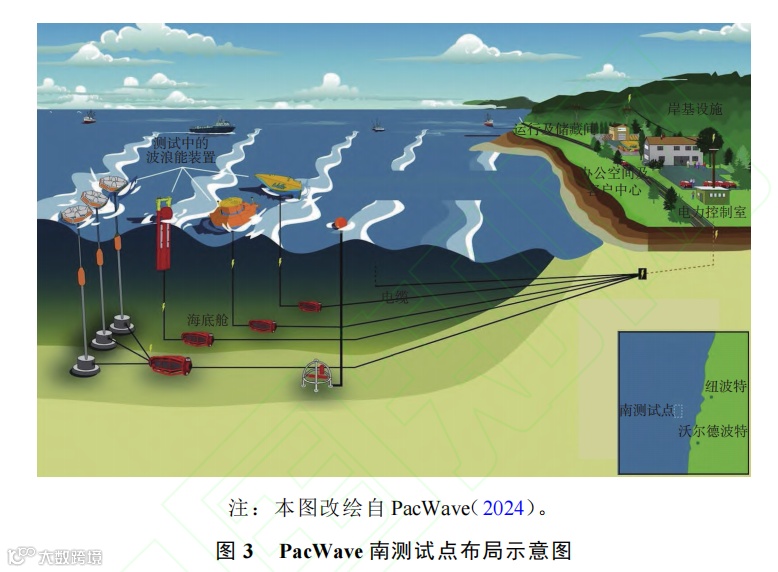 PMEC的海上试验场PacWave位于波浪能资源丰富的纽波特市外海域,由俄勒冈州立大学负责建设运营。它有南北两处测试点。北测试点已经建成,用于小型、原型波浪能装置的非并网测试,距离海岸约3km,相较于南测试点水深更浅,距离港口更近,可持续监测波浪、气象和海洋学数据,提供简化的许可流程。南测试点是一个正在建设且技术先进、获得预先许可并认证的并网波浪能测试点(如图3所示),由美国能源部、俄勒冈州、俄勒冈州立大学以及当地利益相关者共同开发,计划于2025年春/夏并网测试,将是美国本土首个并网的海上试验场。南测试点包括4个泊位,占用大约7km的海域,并有一条长约19km的电缆连接到岸上;可同时测试20台装置,总输出能力为20MW。其选址经过公开征求意见确定,包括当地渔民的重要意见。因为它已获得大多数类型的波浪能装置的预先许可,所以客户无需在测试前经历耗时且昂贵的许可获取流程,大大提高了装置测试的速度。