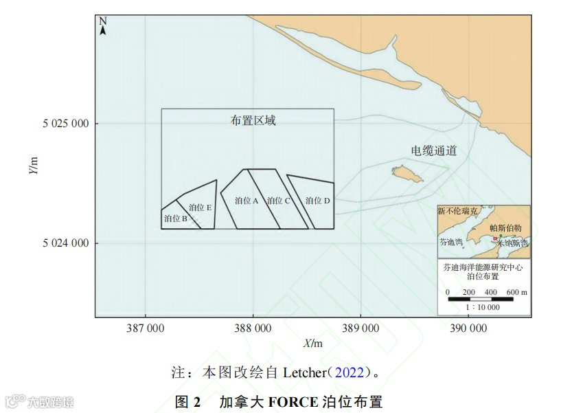 加拿大的芬迪海洋能源研究中心(Fundy Ocean Research Centre for Energy,简称FORCE)是加拿大领先的潮流能测试中心,位于新斯科舍省芬迪湾,其泊位布置如图2所示。该中心于2009年成立,是私立非营利机构,由加拿大政府、新斯科舍省政府、海上能源研究协会以及参与的开发者提供支持。FORCE的成立是行业、政府、社区利益相关者、权利持有者和科学界合作的成果,旨在共同探索潮流能作为一种清洁能源的潜力。这种多方合作有助于确保潮流能的开发既在技术上可行,又能被社会和环境广泛接受。