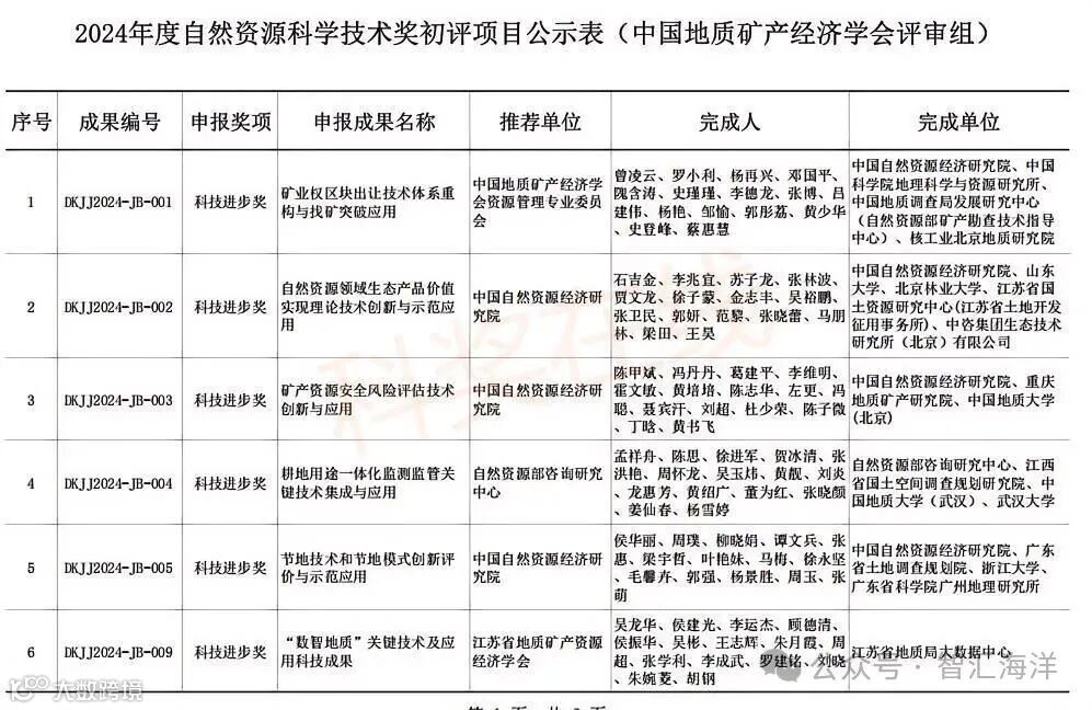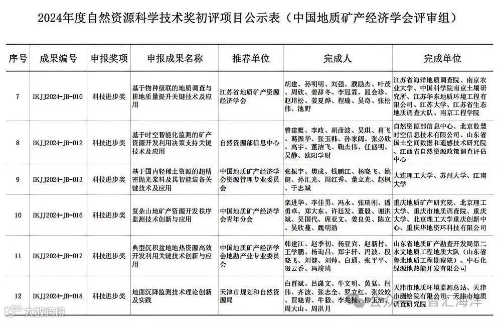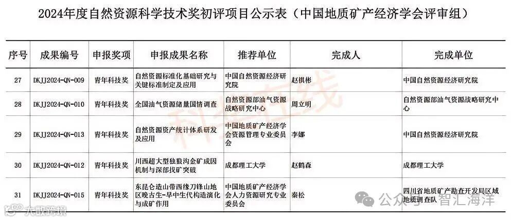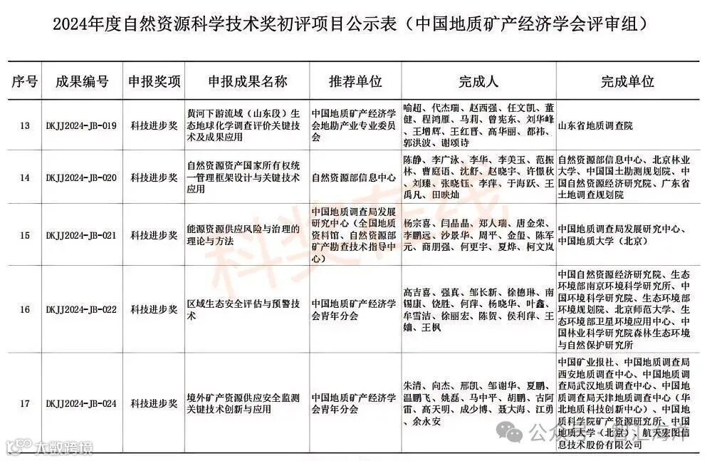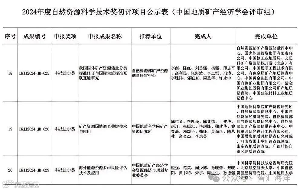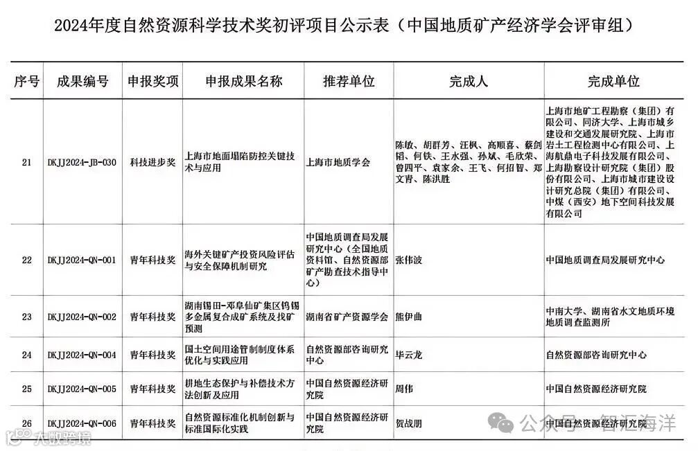 2024年度自然资源科学技术奖初评工作已结束,中国地质矿产经济学会评审组有21项科技进步奖、10项青年科技奖通过初评。
