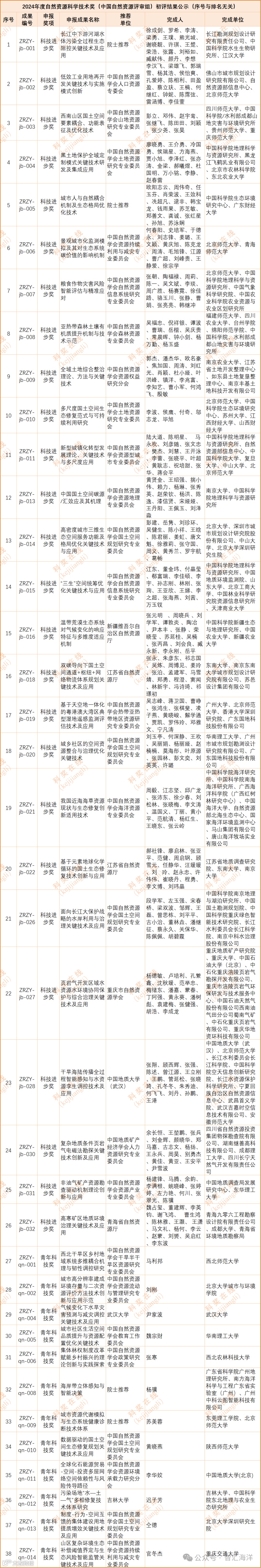 2024年度自然资源科学技术奖初评工作已结束,中国自然资源学会评审组38项成果(26项科技进步奖、12项青年科技奖)通过初评。