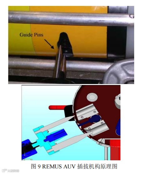 接触式插拔传输方式具有原理结构简单、传输稳定高效的特点。一旦连接成功,传输过程几乎不受任何海洋环境的影响。但是在深海、无人工操纵的条件下能准确、牢固地完成一般的水密连接器插拔十分困难。为此,实现接触式插拔传输技术的关键在于具有特殊功能的水密电连接器与配套的插拔动力装置。该套系统需要具备自动导向对正、便捷锁紧与松开、不受海水压力影响的带水湿插拔能力。图9为REMUS AUV 对接系统采用的插拔机构及其原理图。