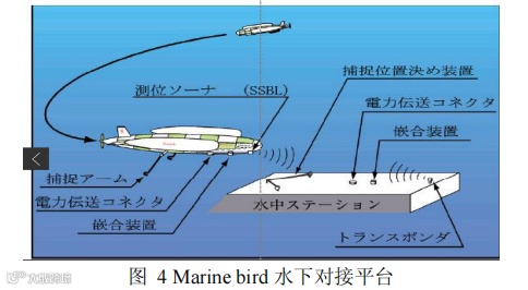 平台式对接是指 AUV 采用飞机降落的方法降落于对接平台上,锁定对接的形式。该种形式的对接方式与飞机在航空母舰上的降落情形非常相似。该方式对水下航行器的动力系统以及自导系统要求较高,具有代表意义的是日本的 Marine-bird 水下对接系统,对接原理示意图见图4。该对接平台通过短基线引导 AUV 回归,并用 V型拦截装置捕捉 AUV 下方的挂钩,最后通过感应线圈进行充电。