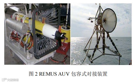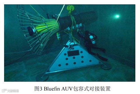 包容式对接是指对接装置采用导向罩或者笼箱等结构形式对 AUV 进行导向,使 AUV 进入对接管或者对接箱笼内完成对接。包容式对接中的对接装置本身可以包容 AUV,在对接口附近采用渐缩形的入口装置对 AUV 进行引导,使其进入预定轨道实现两者的对接。这种形式的对接方式较容易受到海流的影响,优点是对接装置本身并不是特别复杂,也不需要对水下航行器进行特别的改造,并且在 AUV 对接后具有保护作用。典型的包容式对接装置有美国的REMUS AUV水下对接系统(图 2)和 MBARI研究所开发的水下对接系统(图 3)。