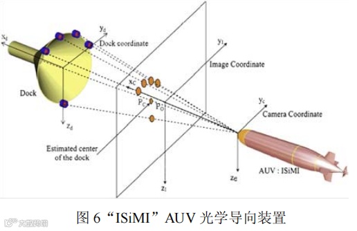 光学传感器在 AUV 对接技术中的使用有其独特的优势与特点,其近距离探测精度能达到厘米级,特别适用于入口较小的对接装置,例如 AUV鱼雷管回收。但是光学传感器受到海水清晰度的影响很大,有效作用距离很近(小于30 m),一般均要与声学传感器(USBL)配合使用。目前基于视觉感知的 AUV 对接技术尚处于研制阶段,例如韩国研究机构正在研究鱼雷型 AUV 与锥形对接装置的视觉导航接驳技术,如图6所示。