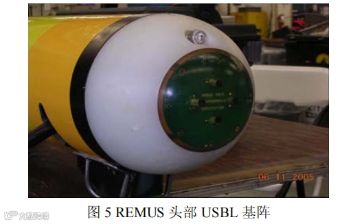 AUV 使用的声学传感器一般指的是超短基线(USBL)。与其他几种传感器相比,声学超短基线的作用距离远(大于2000m),受到的环境影响相对较小,因此国外大多数 AUV 对接技术都采用超短基线(USBL)作为其主要对接导航定位方式。如美军使用最广泛的水下无人航行器-REMUSAUV 就采用了高精度数字式 USBL 作为其对接传感器(图 5)。该型 USBL 模块布置于 AUV 头部,对接引导距离达到 3000 m,分辨力小于 0.5°。美海军多次海试表明,REMUS AUV 在超短基线的引导下能从几海里外,准确地进入直径仅为80cm 的锥形导向罩内,单次对接成功率达到 60%31。