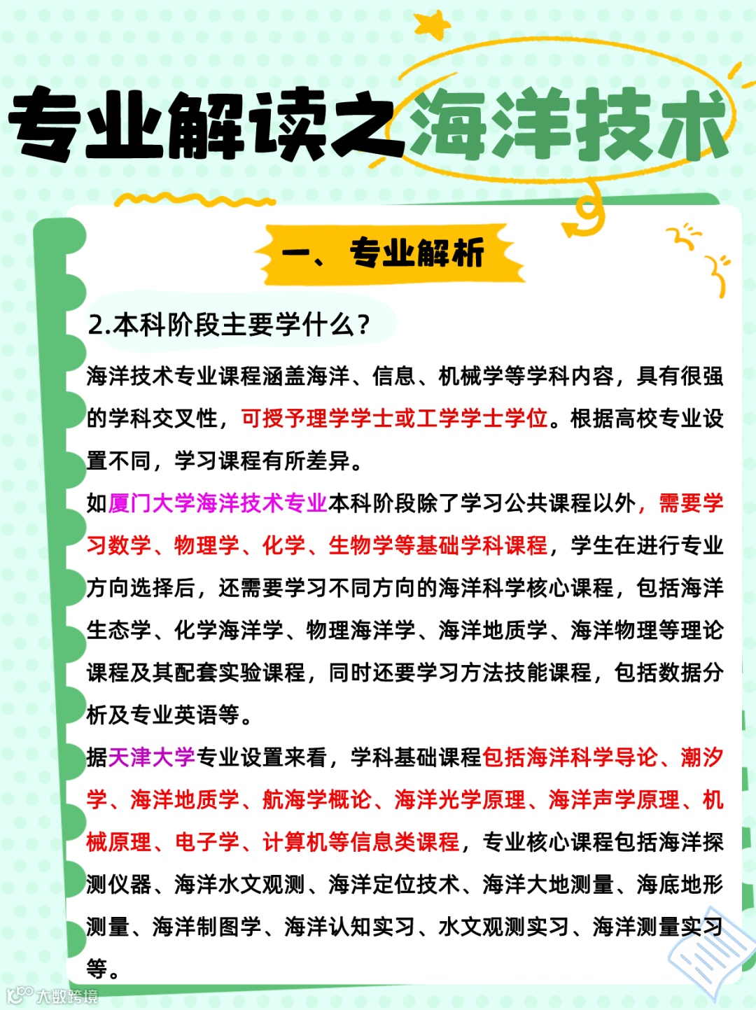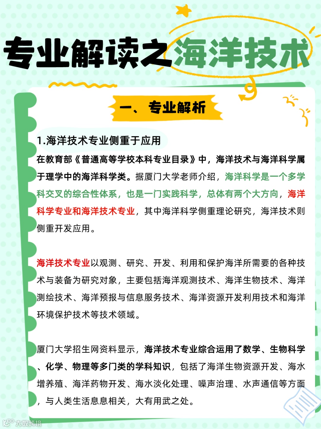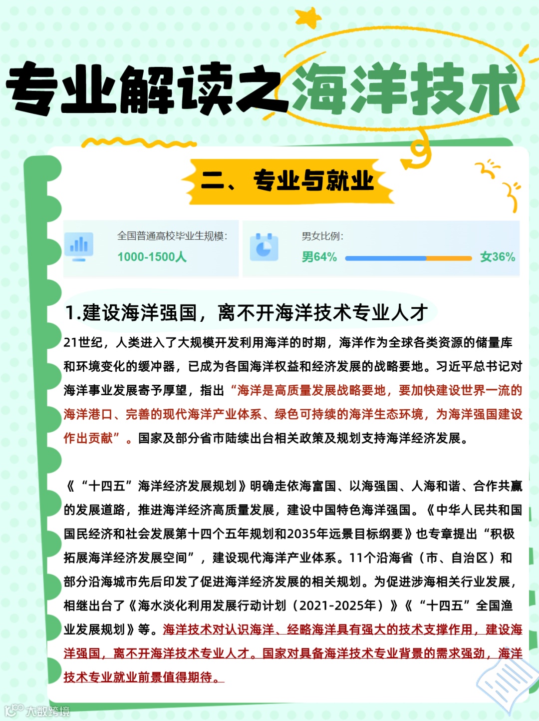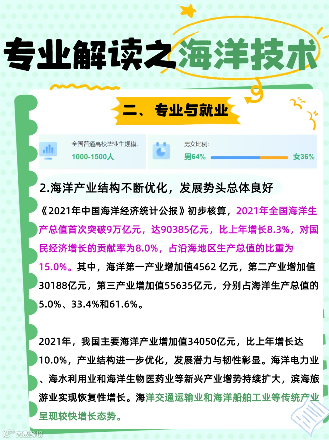 广袤无垠的海洋,约占地球表面积的71%,是孕育人类生命的摇篮,孕育着地球上超过半数的生命。我国是海洋大国,有1.8万公里的海岸线,300多万平方公里的海域面积,拥有丰富的海洋资源。随着科学技术的进步,“上九天揽月,下五洋捉鳖”已逐渐变为现实,但海洋还有很多未知的东西等待人们探索。今天我们就来和大家聊聊与海洋相关的一个专业:海洋技术。