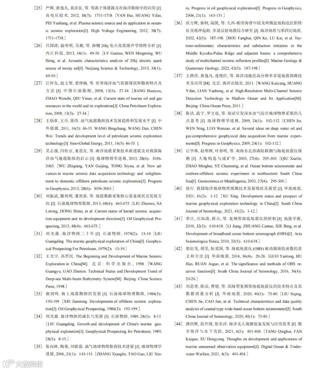 国外海上地震勘探技术始于20世纪30年代是陆地地震勘探向海洋的延伸,只是用小船代替汽车作为运载工具,在海上采用这种施工方式十分费时费力,工作效率极其低下。40年代,有了压电式检波器,无线电定位技术也有所发展,作业区摆脱了近岸,可以去离岸相对较远的海区进行探测,但在当时还是炸药震源,需要另一条船去投放炸药引爆,因无精确定位系统,受船速及海流影响导致观测系统不够准确,这种有别于陆上传统做法的施工方式工作强度也比较大、效率比较低,勘探精度也不高。50年代,海上地震开始使用单船作业,作业效率有了提升,逐步形成了一套海上地震连续作业方式。60、70年代是海上地震调查技术突飞猛进,主要进展为:炸药震源被非炸药震源取代,震源技术的革新,让作业变得更环保、更安全、更高效;多道覆盖技术在海上全面推广,资料信噪比有了大幅提升;卫星导航定位技术得到推广应用,定位精度得到了极大的提升,海上三维地震在这个阶段得到了快速推广。70年代开发出了计算机综合导航定位系统,进一步降低了工作强度,提升了作业效率。80年代初,同轴电缆或光导纤维在采集拖缆中得到应用,信号远距离传输问题得到了解决,采集的道数大幅增加,覆盖次数得到进一步提升。80年代中后期,海上地震进人数字化勘探阶段,与此同时野外采集和室内处理数据能力呈现爆炸式增长。90年代,随着新型 24位遥测地震仪的诞生,海上地震呈现出勘探效率高、数据品质好等特点。与此同时,海底电缆、4D地震等海上地震采集新技术相继开始应用”。