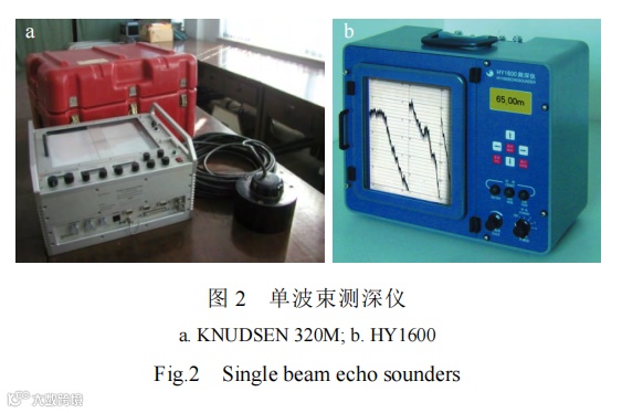 1914年,美国设计制造第一台回声测深仪:1940年,周同庆研制出中国第一台自动回声测深仪"。目前,各种测深仪广泛应用于生产、工程和科研的各个领域。常用的测深仪型号繁多,性能各异。美国 ODOM 公司的 Echotrac系列测深仪、加拿大 KNUDSEN公司的KNUDSEN 320系列测深仪(图 2a)、挪威 Kongsberg 公司的 EA 系列测深仪我国中海达的 HD系列测深仪、海鹰HY系列测深仪(图 2b)、南方SDE系列测深仪是目前国内使用率较高的单波束测深设备。