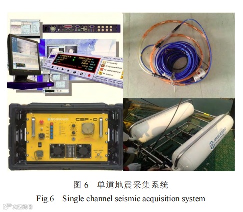 单道地震采集系统主要由接收系统和震源系统组成2(图6)。在浅海进行高频地震数据采集时一般使用电火花震源,国外常用的单道地震电火花震源生产厂家主要有英国 AAE 公司、法国 SIG公司、荷兰 Geo-Resource 公司等。1965 年开发了空气枪震源,气枪震源具有结构简单、施工效率高、寿命长、可靠性高、同步性好以及高环保性的作业特点,主要应用于石油勘探、海洋地球物理调查等领域。气枪震源主要生产厂家有美国 BOLT公司ION公司和法国 SERCEL公司。接收系统由接收机和单道水听器组成,单道水听器主要技术指标有检波器个数、间距、声压灵敏度、接收有效带宽等指标,一般为水面拖曳型,采用压电检波器(灵敏度高,频率响应宽),地层分辨率高。目前常用的单道水听器主要有 20 单元、48 单元组合检波器。