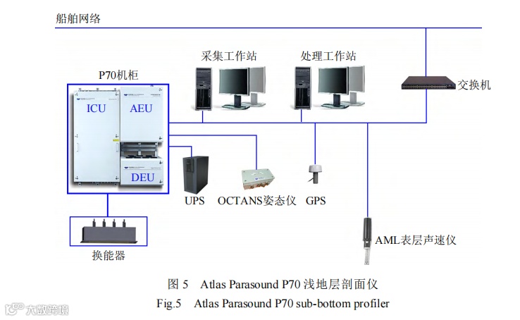 20世纪 40年代,国外已经开发出海底浅地层剖面仪的样机,20 世纪 60 年代进入应用阶段,出现商用设备。受当时技术条件的限制,探测结果只能记录在不能长期保存的热敏纸带上,也不能对采集到的资料进行有效的后处理,影响了浅地层剖面地层探测的精度,增加了解释的工作量和难度。20 世纪 90 年代以来,随着科学技术的飞速发展,浅地层剖面调查系统也相应地进行了技术革新中7进入21世纪后,三维高精度浅地层剖面仪已经应用于海洋地质调查,获取了精细的海底结构三维图像。国外成熟的浅地层剖面仪产品有挪威Kongsberg 公司生产的 TOPAS PS 18/40,德国Innomar公司生产的 SES96、SES2000,德国 Atlas 公司生产的 Atlas Parasound P70P(图5),英国 GeoAcoustics公司生产的 GeoChirp Il、GeoChinp 3-D等。