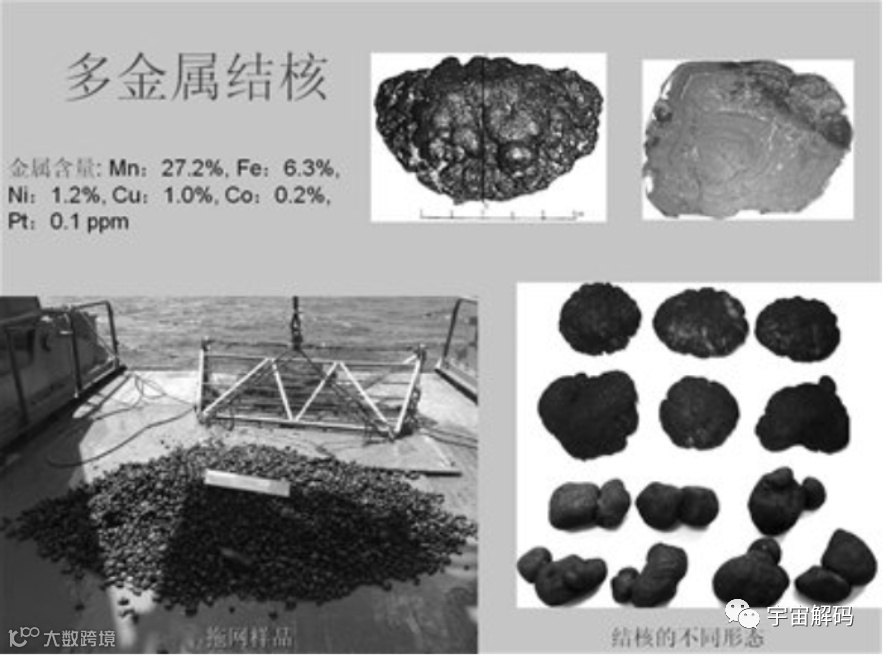 海洋里除了我们熟知的煤、石油、天然气,还有很多金属结核。多金属结核又称锰结核,是一种以铁和锰元素为主的矿石,存在于3500到6000米的海底,通常为直径5至10厘米的不规则球体。锰结核主要来自于海底火山喷发以及海水对海边岩石的腐蚀。据估计,全球的锰结核大约含有2000亿吨的锰,此外还有大量的铜、钴和镍。