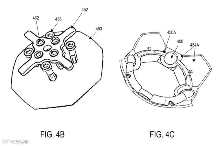 船体板块包括一个大的八边形顶板453和底板455,提供了通往四个中央板固定螺栓的入口460、468。顶板453还允许连接可拆卸的携带手柄。十字形的携带手柄452可以稍微下沉以暴露内凹的六角螺栓头462,方便拆卸。图4F展示了底板455,它是一个与顶板尺寸相同的八边形,但带有四个大型孔466用于隧道推进器进气口,以及四个六角形孔468用于防止在上部板固定螺栓拧紧或松开过程中旋转下部固定螺栓。底板上还包含五个端口(四个小的压载端口470和一个大的中央载荷端口472)。三个中央板环454A-C(包括上板环454A、赤道环454B和下板环454C)由四个小方形和四个六角形组成,中央环454B的八边形比上部和下部环的六角形更大。
