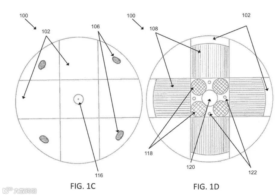 三个套筒,包括两个纵向弧形套筒(极地套筒102)和一个赤道环套筒(赤道套筒110),允许四个传感器扇区旋转。极地套筒102在垂直平面内绕几何中心旋转,而赤道套筒110在水平平面内围绕几何中心沿着套筒轨道108旋转,最多可达180度。图1C展示了套筒配置的俯视图,图1D展示了套筒配置的底视图。