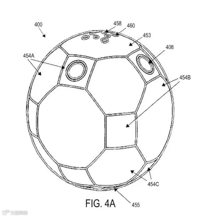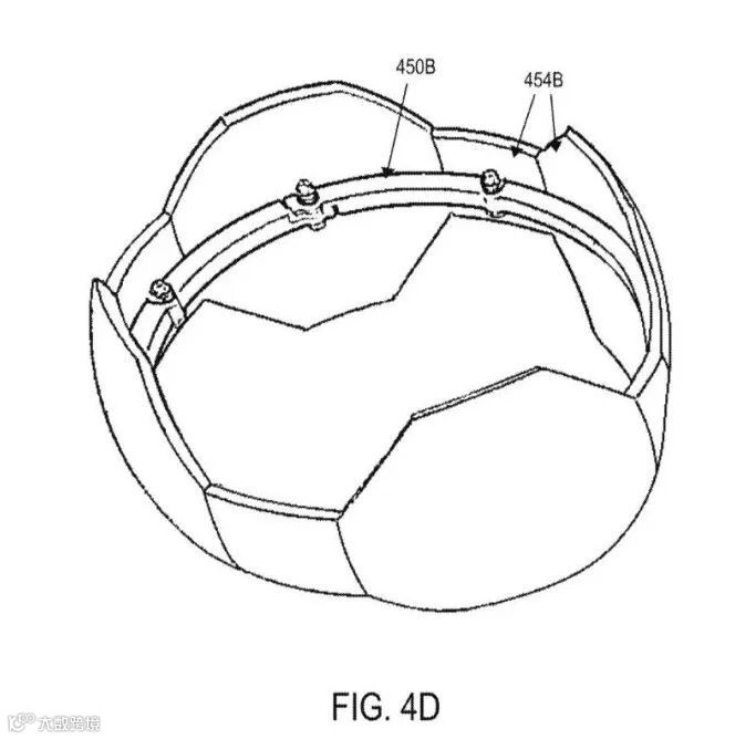 图4A展示了AUV 400的一个球形镶板船体。在操作过程中,携带手柄(在图4A中未显示)被移除,形成一个光滑的球体。在该实施例中,展示的船体没有在每个板块(453、454A-C、455)中集成摄像头。在其他实施例中,AUV 400的设计可以在每个板块上(453、454A-C、455)内置支持安装摄像头的结构,使得摄像头镜头与船体外部齐平。在某些情况下,所有部件都是3D打印的,并通过不锈钢紧固件通过紧固孔进行连接。