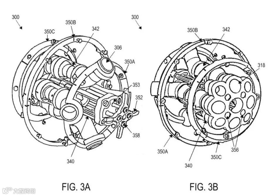 图3A-3C展示了一个示例AUV 300的内部结构。图3A和3B分别显示了该示例AUV 300的顶部和底部透视图,图3C展示了AUV 300的俯视图。该AUV 300采用了内部隧道推进器342的设计。图3A展示了内部推进器342的隧道推进器出口306,图3B展示了内部推进器342的隧道推进器入口318。紧邻内部推进器342的是AUV 300的压载舱340。