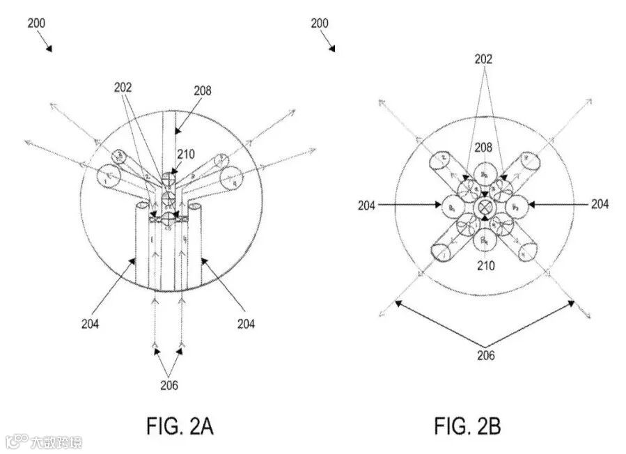 图2A和2B展示了示例AUV 200中隧道推进器的水流路径。AUV 200使用四个倾斜的隧道推进器202来提供推进力。隧道推进器202对称地分布在中央载荷管208周围,中央载荷管内装有可部署的网络信标210。内部的推进器配置202最大限度地减少了推进器被碎片缠绕的风险。向上的螺旋桨喷流206减少了沉积物的扬起(silt-out)现象。由于沉积物大多聚集在水下结构的底部,将喷流206朝上定向可以避免大部分沉积物受到扰动。这种技术类似于技术潜水员的蛙泳踢水动作。