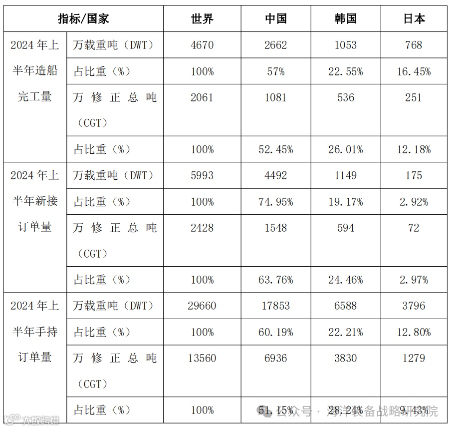 表1. 2024 年 1-6 月份世界造船三大指标分析